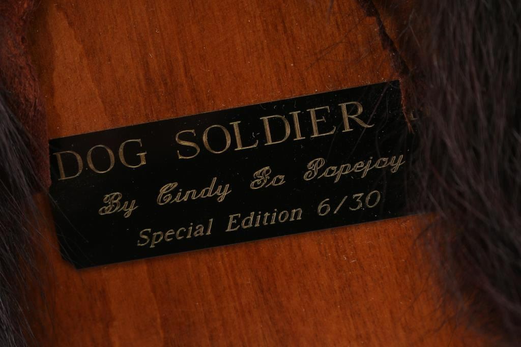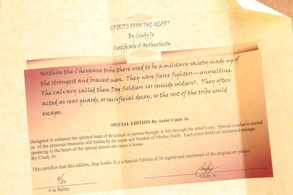 Titled "Dog Soldier", #6/30, Spirits From The Heart. From the artist: "For more than thirty years, I have immersed myself in the study and creation of Native American art. My love for the narrative beauty of Native American culture, as well as a desire to honor my Cherokee heritage, has driven me to understand and represent the character, strength, and honor of Native American people. I am a self-taught artist, competent in ceramic, clay, bronze, and other mixed media, and I am meticulous in researching and understanding the subject matter I represent with each of my pieces. My intent is always to make my art speak to my audience. If eyes convey emotion, posture portrays movement, and detail portrays a story, then I know my pieces are conveying the stories I wish to tell with each one. My work and business accomplishments have been recognized both locally and throughout the Mountain West. I have been highlighted in magazines such as Cowboys & Indians and Western Art & Architecture, and my various awards and business endeavors have been recognized in local publications such as the Idaho State Journal and the Blackfoot Morning News. I independently owned and operated my own business, From the Heart of Idaho, where I sold my own artwork as well as that of various other local artists. I took great pride in showcasing my talents and providing an avenue for other developing artists to thrive." Comes with Certificate of Authenticity.