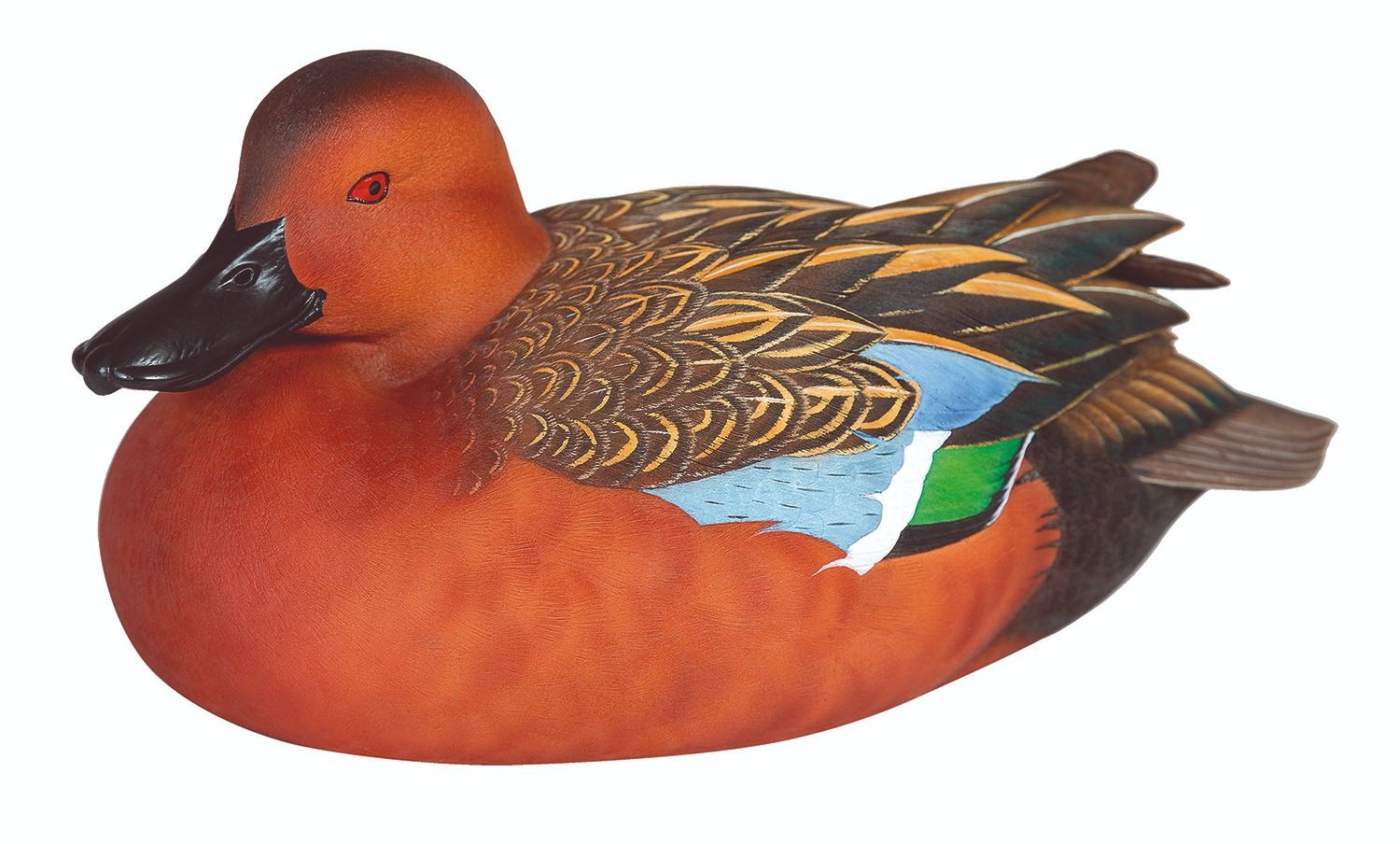 This cast resin cinnamon teal decoy by Jett Brunet is created in exacting detail. Jett started carving at the age of nine and in that same year he started entering competitions. The decoy includes a felt covered bottom inlaid with a Ducks Unlimited medallion.