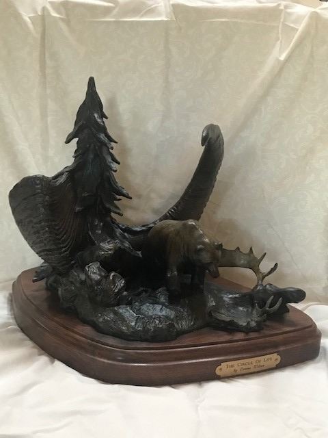 The “Circle of Life” bronze by Donna Wilson is a magnificent depiction of the reality that is part of the daily existence of all living things! The bronze depicts a grizzly bear on a moose kill with a large sheep horn and a pine tree in the background and was inspired by a hunter who harvested all three species depicted on a hunt with Kawdy Outfitters in northern British Columbia in the late 1990’s. The bronze features a beautiful patina and is mounted on a solid wood base. The bronze and wood base measure approximately 14 inches tall, 19 inches long and 12 inches wide. The bronze weights approximately 25.5 pounds. “The Circle of Life” bronze is number 8 of a sold-out-edition of a total of 10 pieces. To the best of our knowledge, this is the only bronze in the complete edition series that is available for purchase. Buyer is responsible for packing, shipping and insurance.