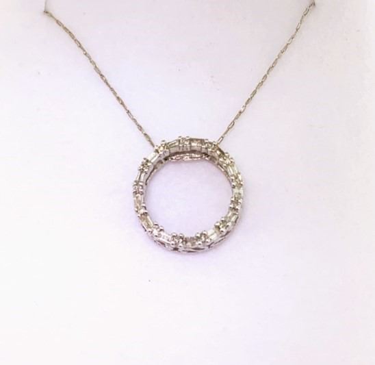 Ladies Necklace in 14kt white gold with filigree circle mounting and approximately 1/4 carat natural round and baguette diamonds.