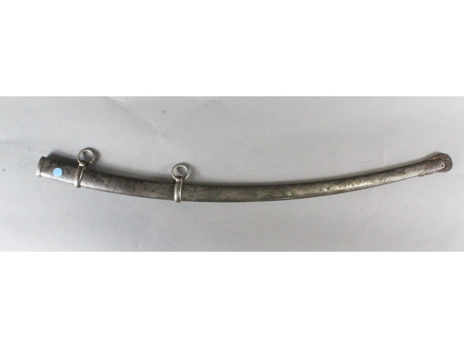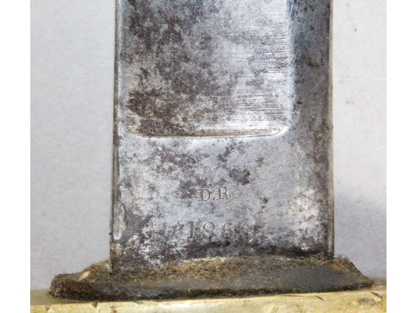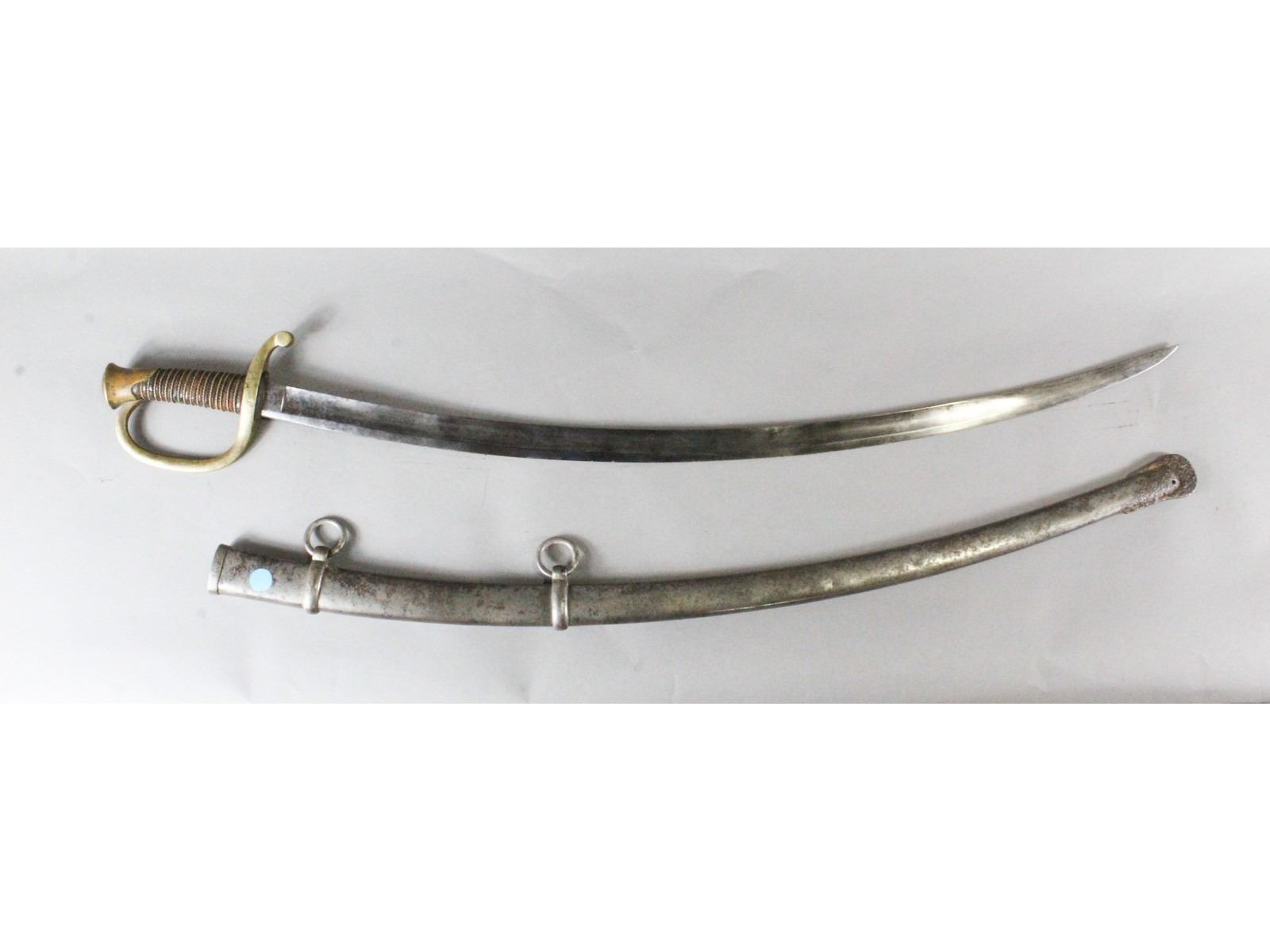 Nice blade. Dated 1863. Made by Ames, Chicopee, Mass. Brass hilt. Leather wrapped grip with fancy brass wire showing slight wear. Steel scabbard with heavy pitting on the drag.