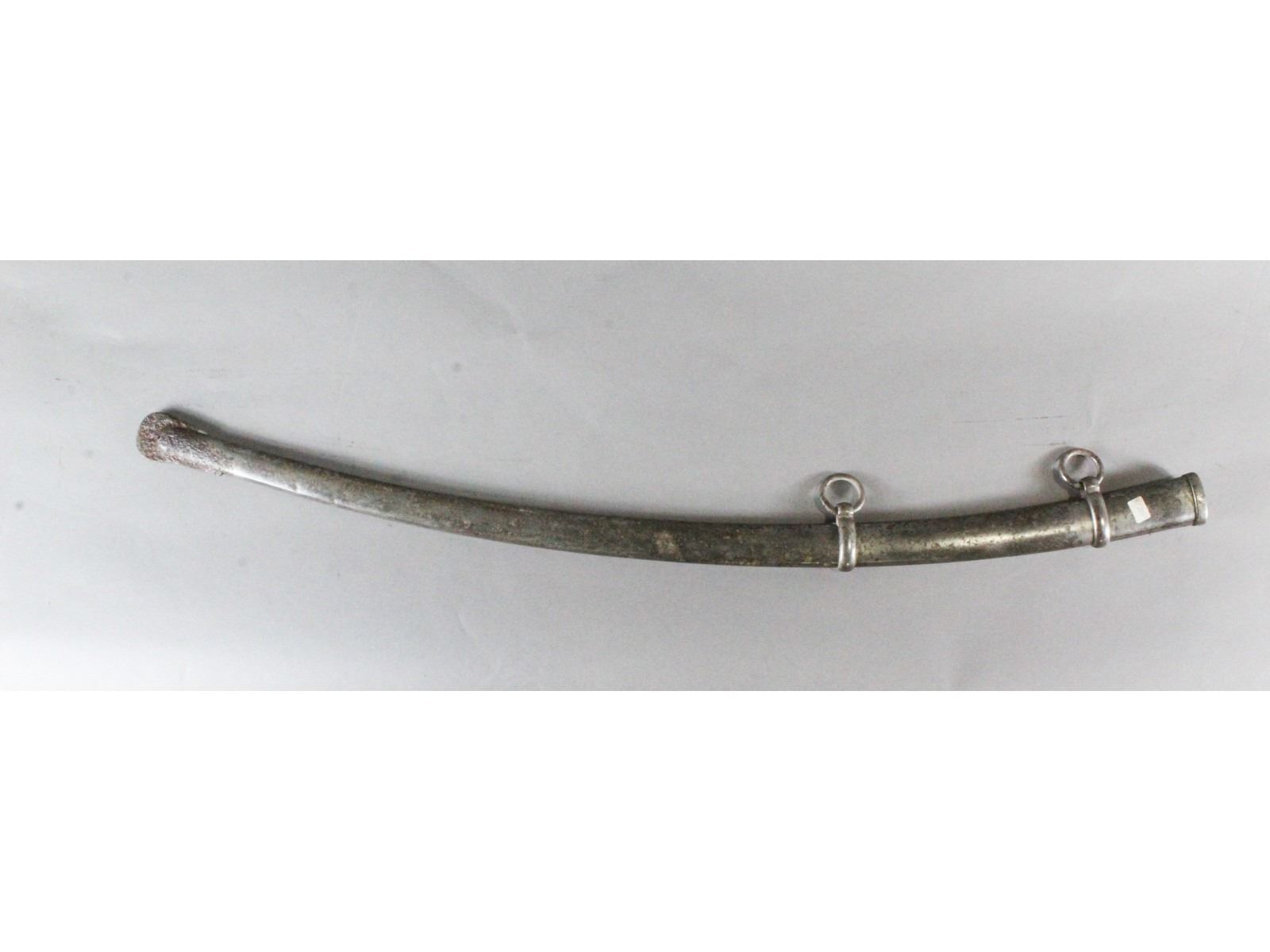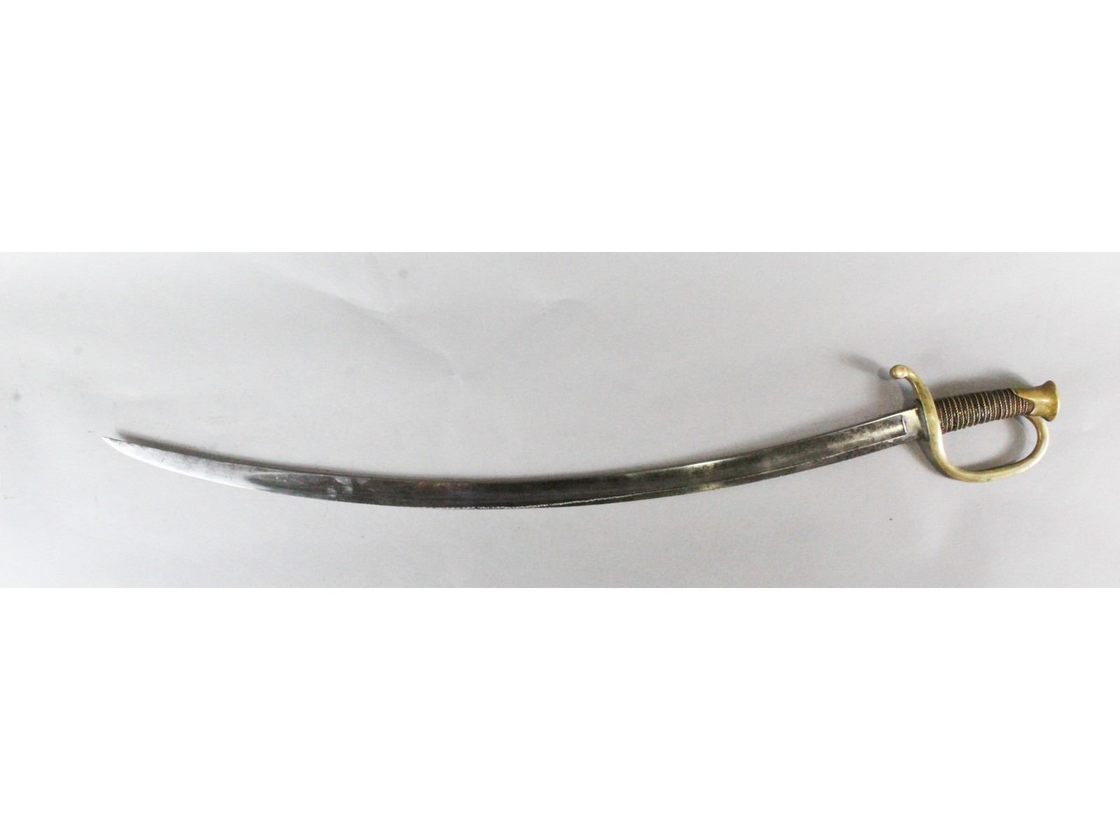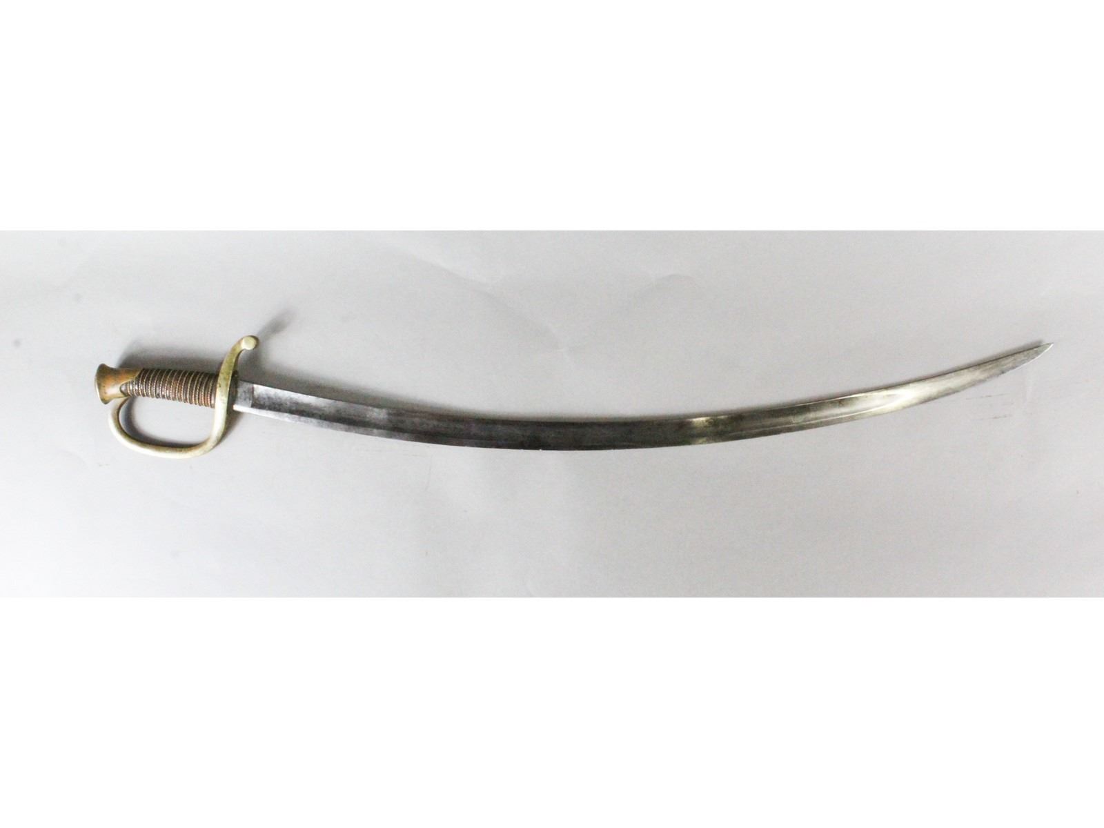 Nice blade. Dated 1863. Made by Ames, Chicopee, Mass. Brass hilt. Leather wrapped grip with fancy brass wire showing slight wear. Steel scabbard with heavy pitting on the drag.