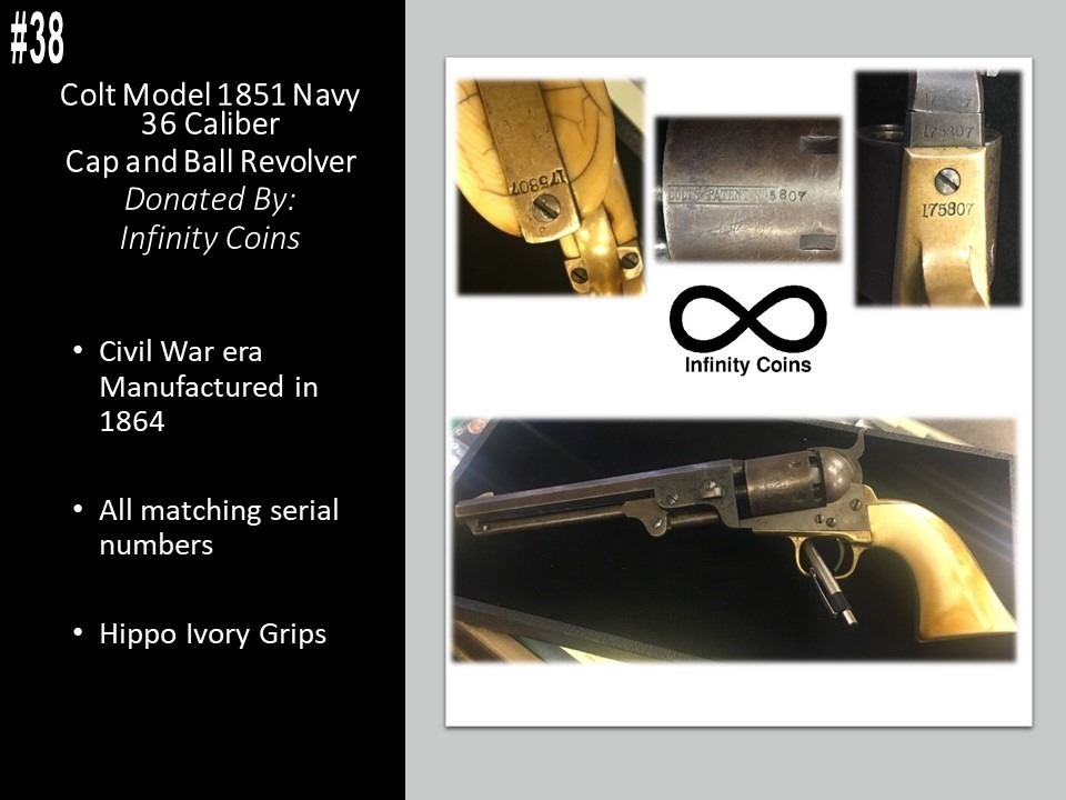 Colt Model 1851 Navy 36 Caliber Cap & Ball Revolver. Manufactured in 1864, with all matching serial numbers, hippo ivory grips. Its Very Likely this piece saw action during the Civil War.The Model 1851 was carried by Confederate General Robert E. Lee, and was a favorite of “Doc” Holliday and “Wild Bill” Hickok, who carried two of these most famously in his red sash. Own a Piece of History!