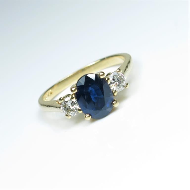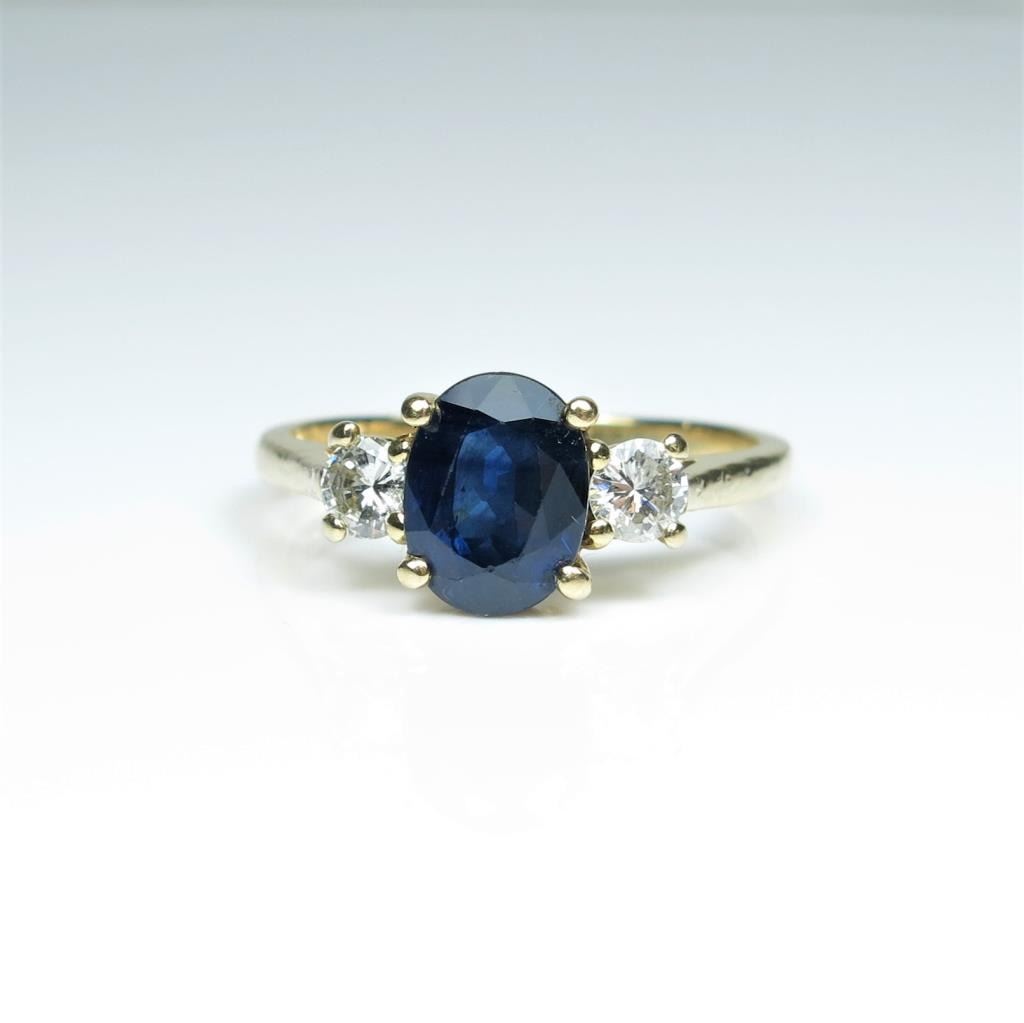 featuring an oval Royal Blue Sapphire weighing approx. 2.00 carats accented with 2 round cut Diamonds weighing approx. 0.30 carats with H-I colors and SI clarity set in 14 karat yellow gold. Retail $2,000-$3,000