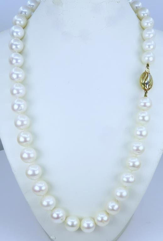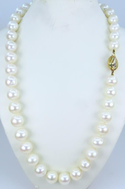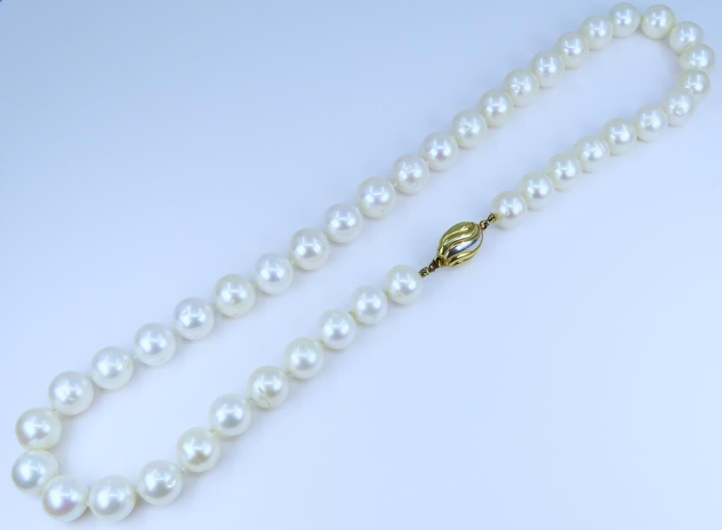 Featuring an 18” inch strand of White Pearls with blush overtones averaging 10.50 mm in diameter accented with a stylish 14 karat two tone gold clasp. Retail $4,000-$5,000.
