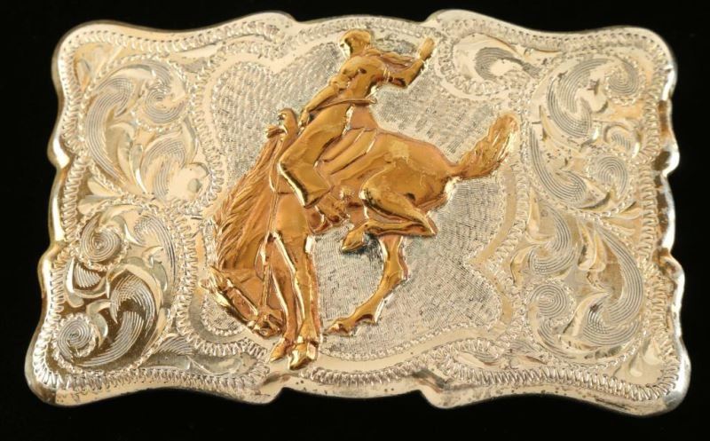 Longhorn, Dallas Texas, measures 3 1/2"w showing a cowboy on a bucking bronco. Nicely engraved background 1950s-60s era.