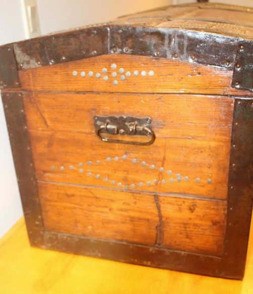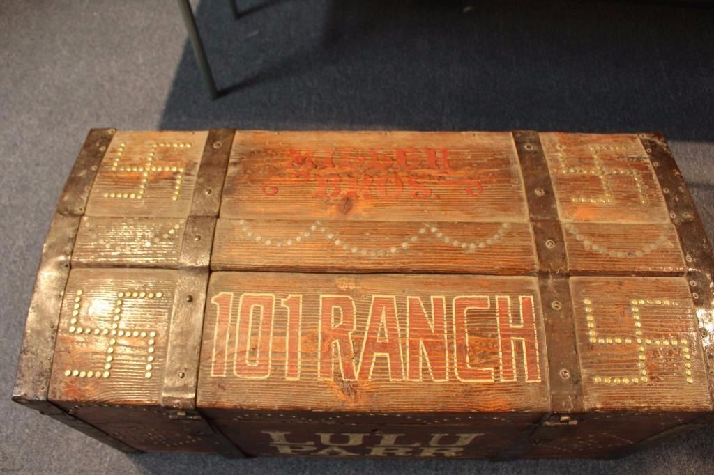 Classic old forged steel banded wood traveling trunk painted on front “LULU PARR” and “MILLER BROS”/“101 RANCH” on the top with brass tack decorations, approximately 37” long x 16” high x 18” deep in overallgood condition. Hand written letter and other assorted documents accompany this lot. The letter states the trunk was found at a flea market in 2009 near St. Cloud, Minnesota. The Miller Bros lettering was reportedlystill partially visible as apparently was the 101 Ranch lettering and LULU PARA marking. The letter further notes “The only background information came from the daughter of the couple who had purchased the trunk at a salein Ohio. Her name was Anna Johnson who lives in St. Cloud. Her parents lived in Columbus, Ohio from 1947 ‘till the 80’s”. After their death, the trunk remained in an old building on her brothers farm for some 20 years.Additionally, the letter notes the trunk was subsequently carefully cleaned and restored where needed by Paulette Berndt, of a town near Jamesport, Missouri. She also prepared the accompanying research binder on Lulu Parr
