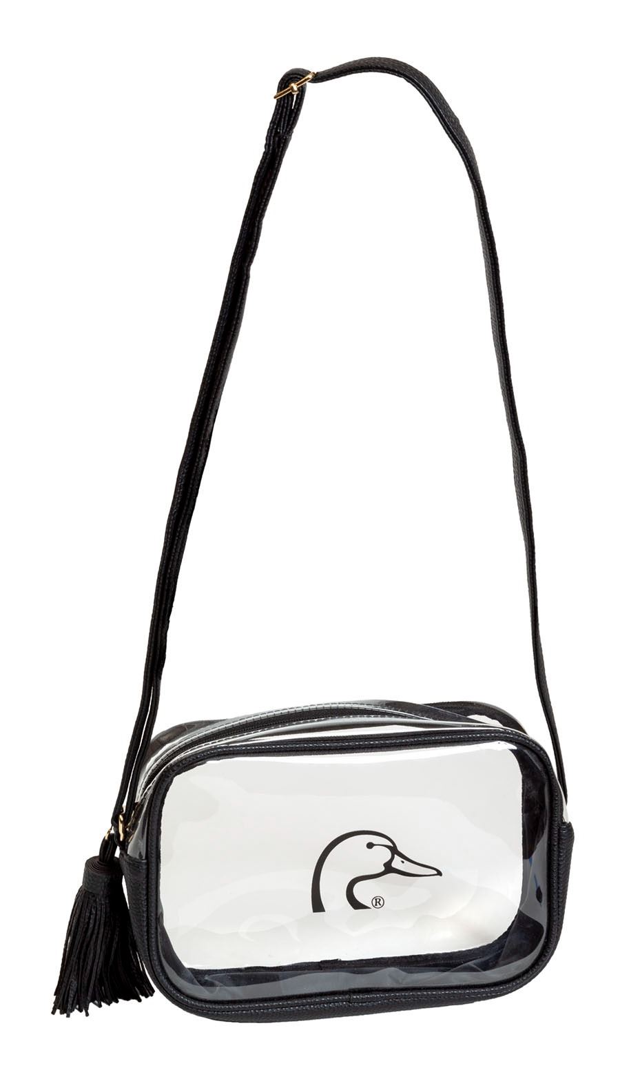 Perfect for football games and concerts. Clear rectangular bag features black faux leather trim, and a screen printed DU logo. Adjustable strap for crossbody or over the shoulder wear. Size within clear bag policy limits. 10” x 3” x 7”