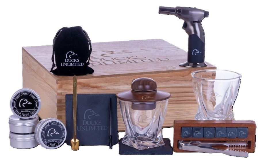 Complete cocktail smoking kit elevates any drink experience with a custom ash wood box that houses all essentials. Included are a metal lighter, a wood smoker with stainless steel filters, whiskey stones, tongs, and two twisted low-ball glasses. Additional accessories feature two slate coasters, a black velvet bag, and four wood-filled tins (oak, cherry, apple, hickory), all branded with the Ducks Unlimited logo. Measuring 13.25” x 12.625” x 4.75”, the kit combines style and functionality for the ultimate cocktail presentation.
