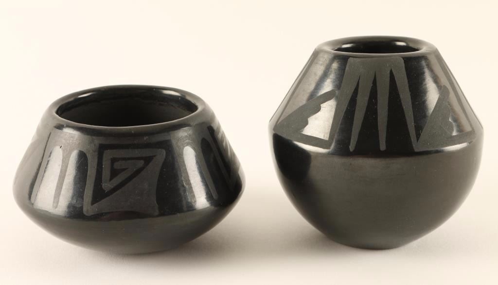 Black on black geometric design, unsigned, the other is a Ildefonso brown pot signed Juan Povi.