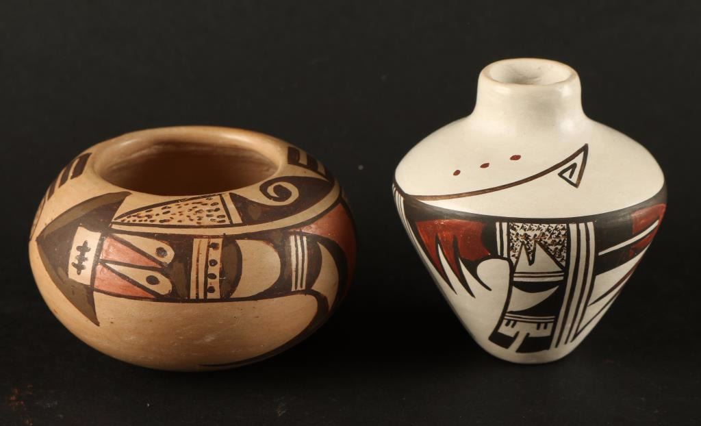 Small white and brown geometric pot signed by Hopi artist "Frog Lady" and one other polychrome pot signed by 'Fannie Nampeyo".