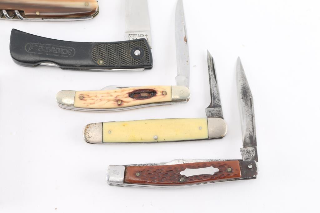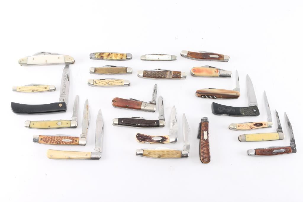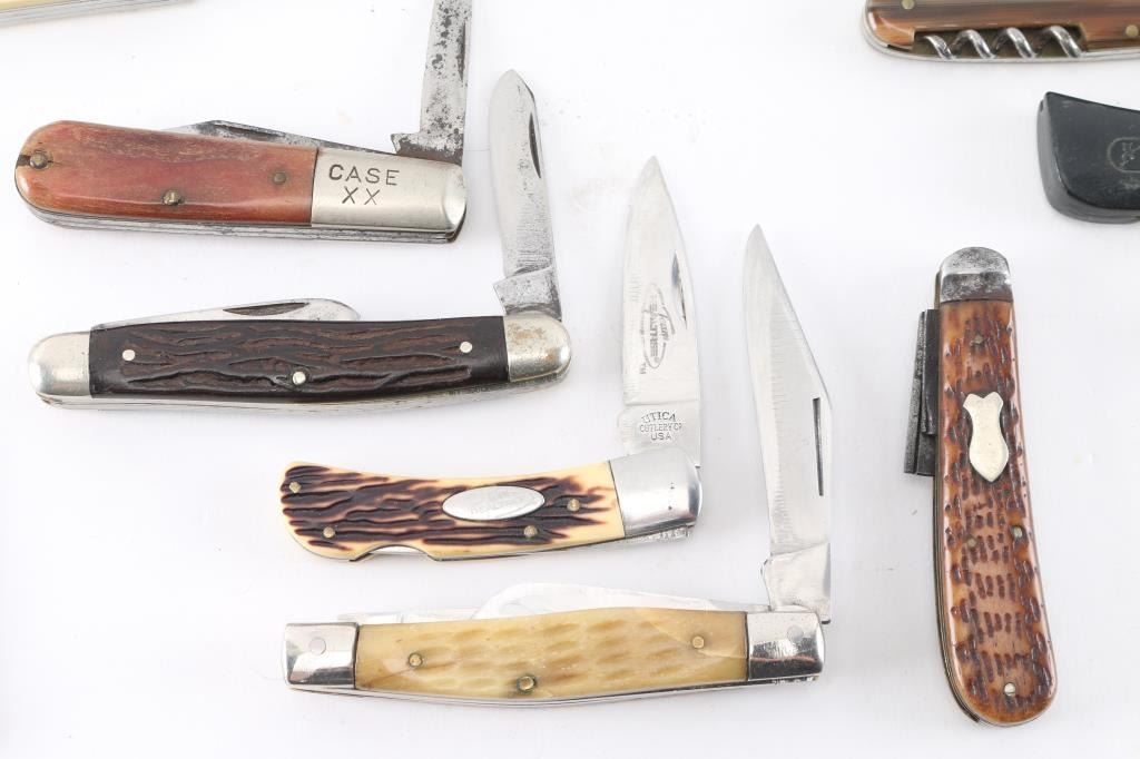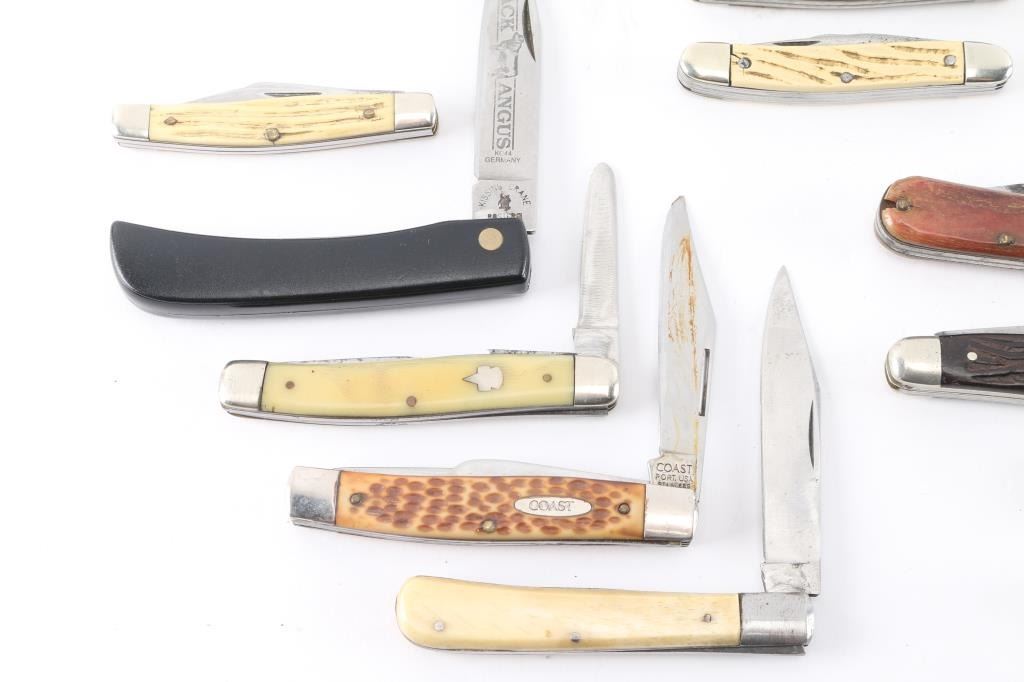 Maker marks from Remington, Colonial, Old Timer, Coast, Utica Cutlery, Sabre, Kissing Crane, Schrade, Camco, Case, Kutmaster & Rostfrei. Many unmarked, various conditions.