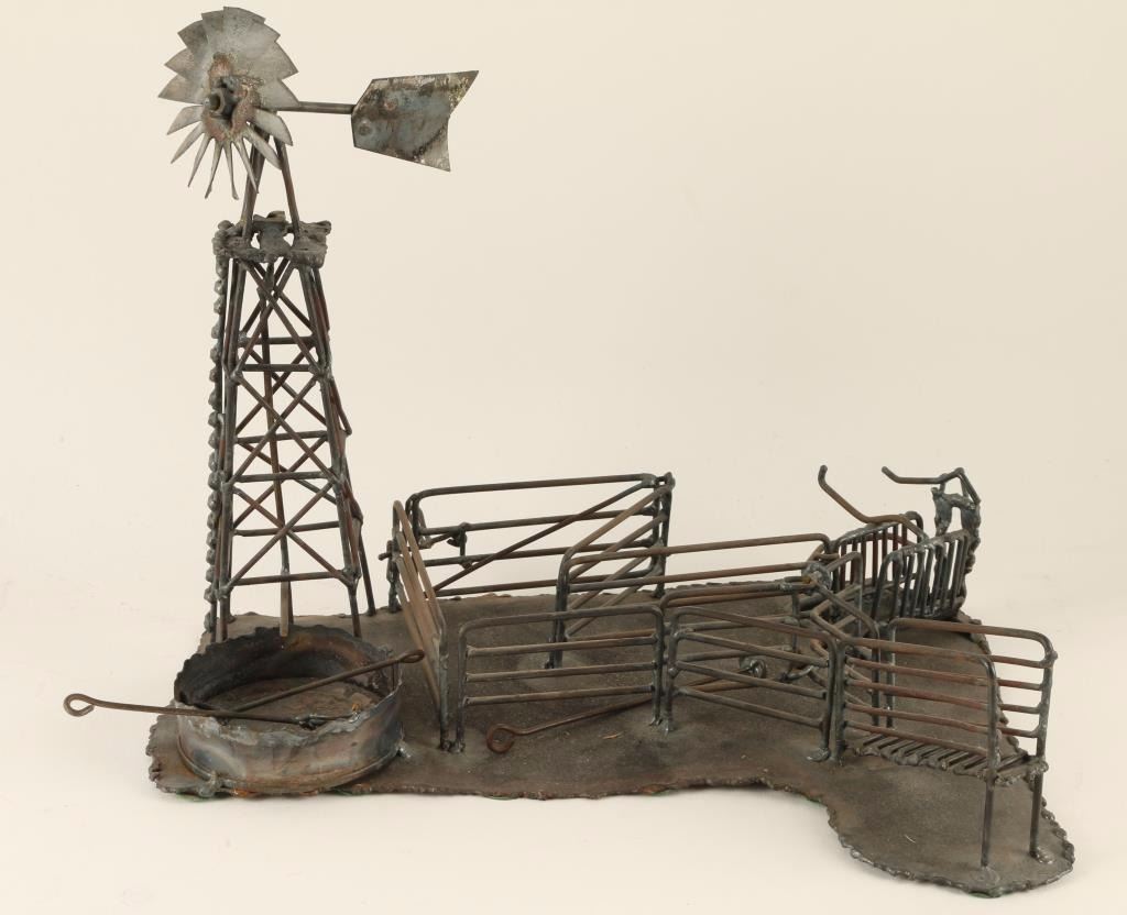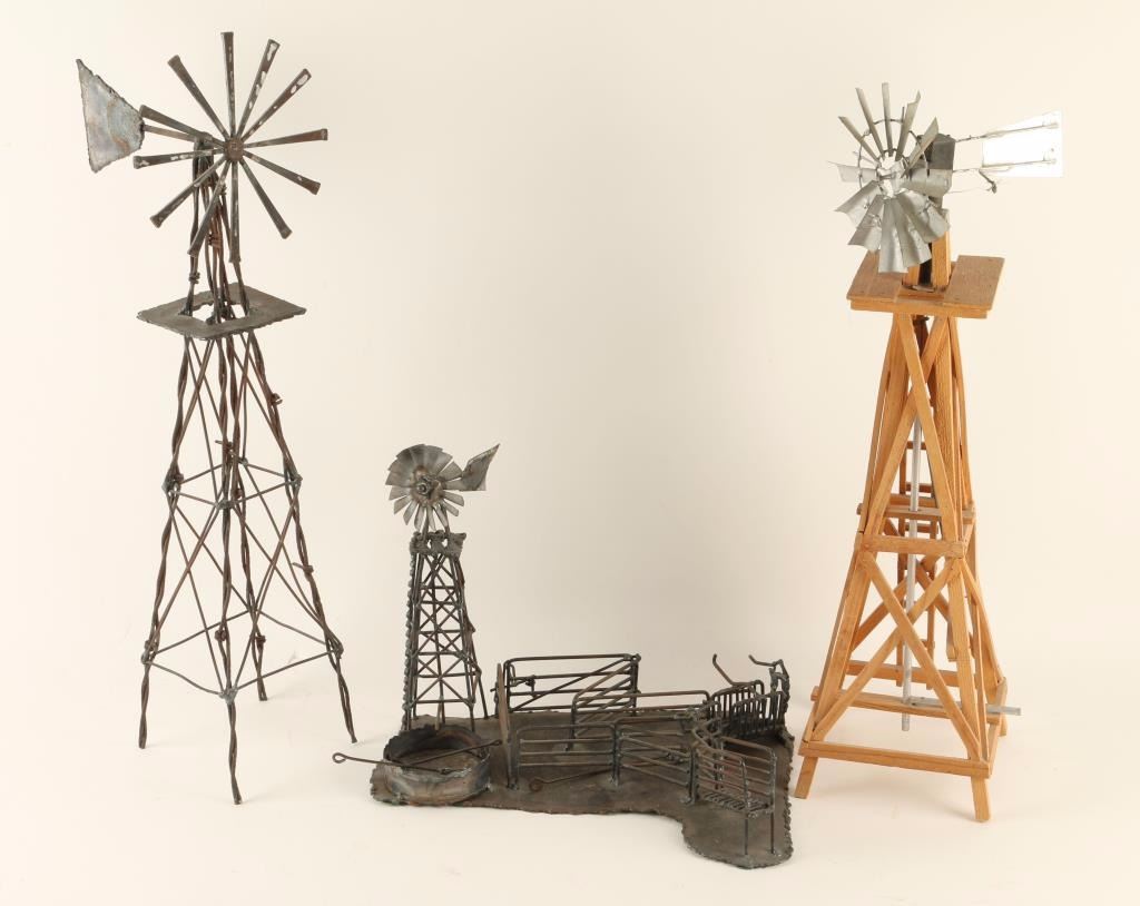 1 mace of barbed wire, 1 wooden windmill and 1 metal windmill set with loading pen, catch chute and branding irons. Great decorator pieces!