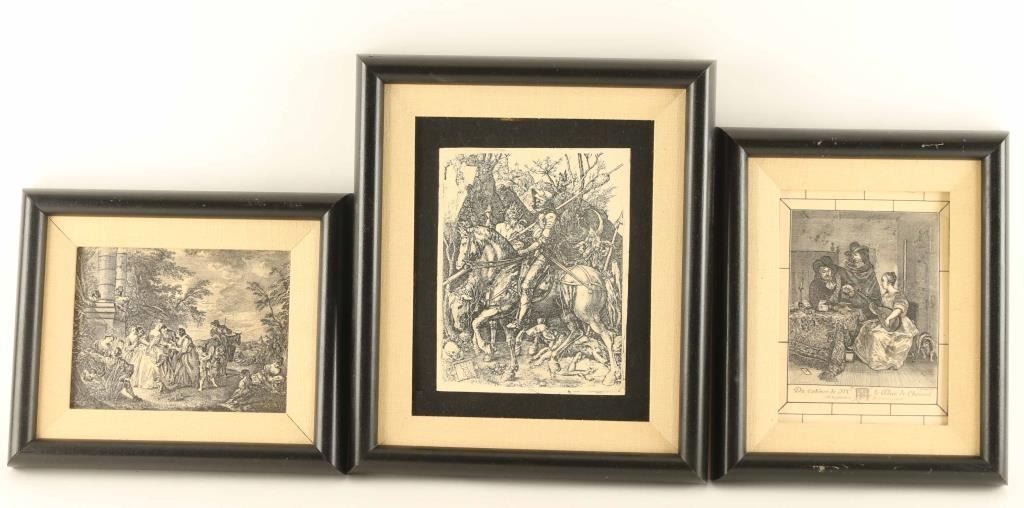 All (3) different but framed alike in black frames. Smallest is 7" x 5", then 7 1/2" x 5" and appears to have been glued at corner, and largest is 8" x 6".