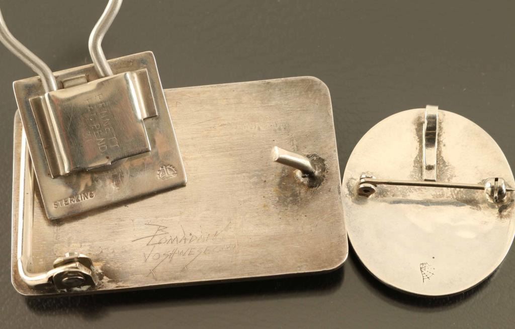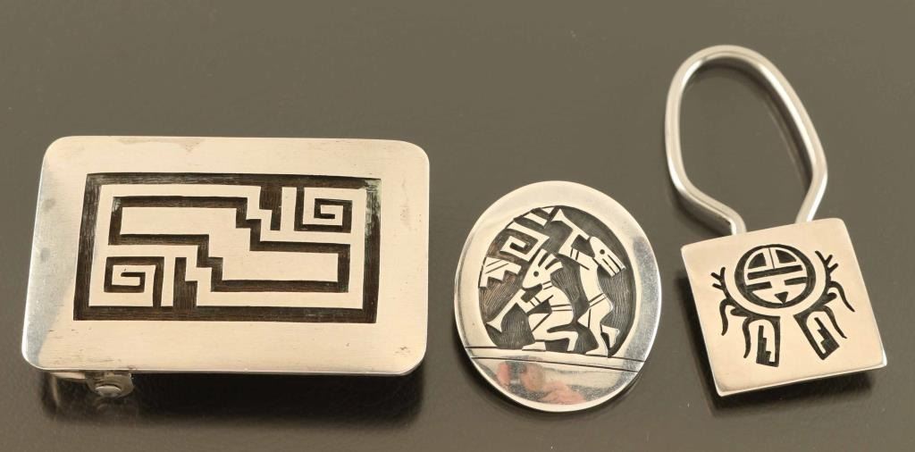 including (1) Sterling Hopi Key chain made by Leon Lomakema.(1) Sterling Hopi Belt Buckle made by Robert Lomadapki (1) Sterling Pin/ drop made by Hopi artist Vern Mansfield. From the Spike Flanders Collection Silver City New Mexico.