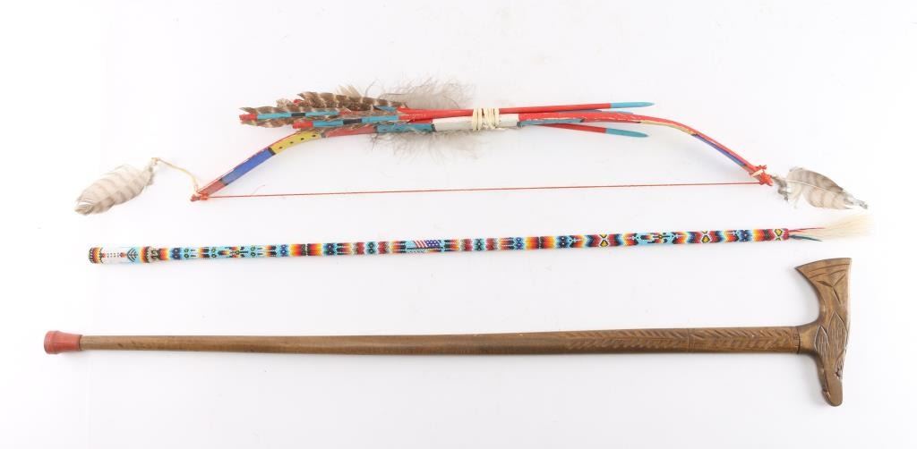Includes a wooden cane, 37". A fully beaded medicine stick, accented with horse hair. 33" long. And a painted bow and arrows.