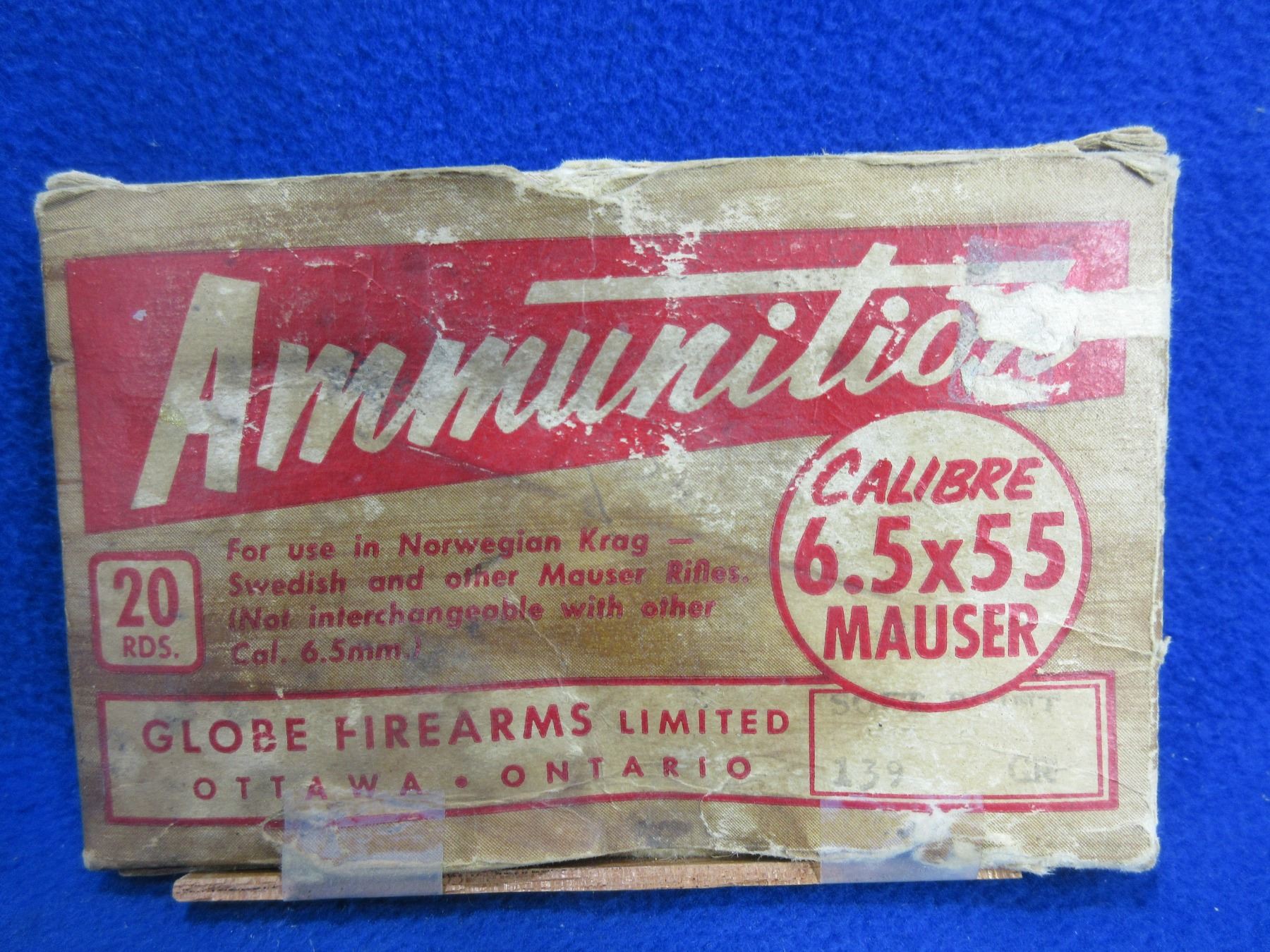 Collector Ammo - 6.5X55 Mauser Globe Firearms Cartridges - Box of 18 - Box is Damaged - PICK UP ONLY