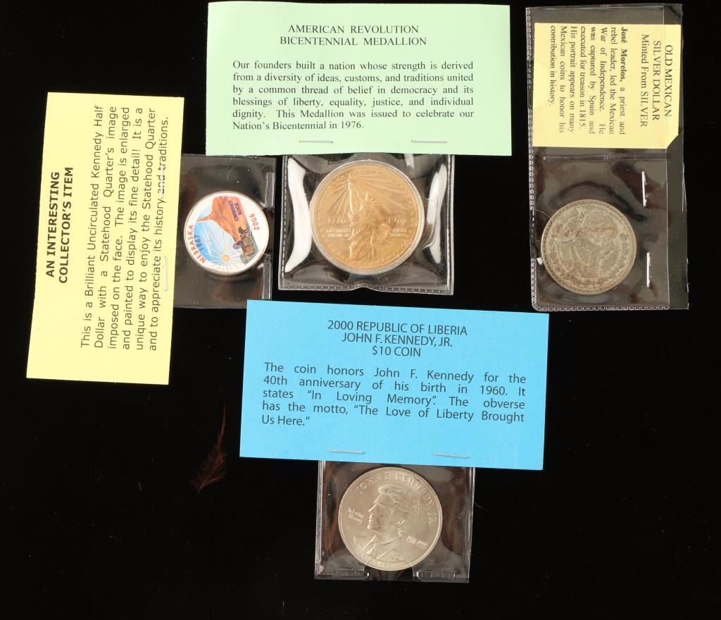 Including; Uncirculated Kennedy Half Dollar with Statehood Image, American Revolution Bicentennial Medallion, 9 Basketball Trader Cards, "Celebrate the Century 1930-1939 Household Conveniences" 24K Commemorative Stamp, 8 Foreign Coins,Old Mexican Silver Dollar, 2000 Republic of Liberia John F. Kennedy, Jr. $10 Coin, and a bag of 25 assorted coin tubes and holders.
