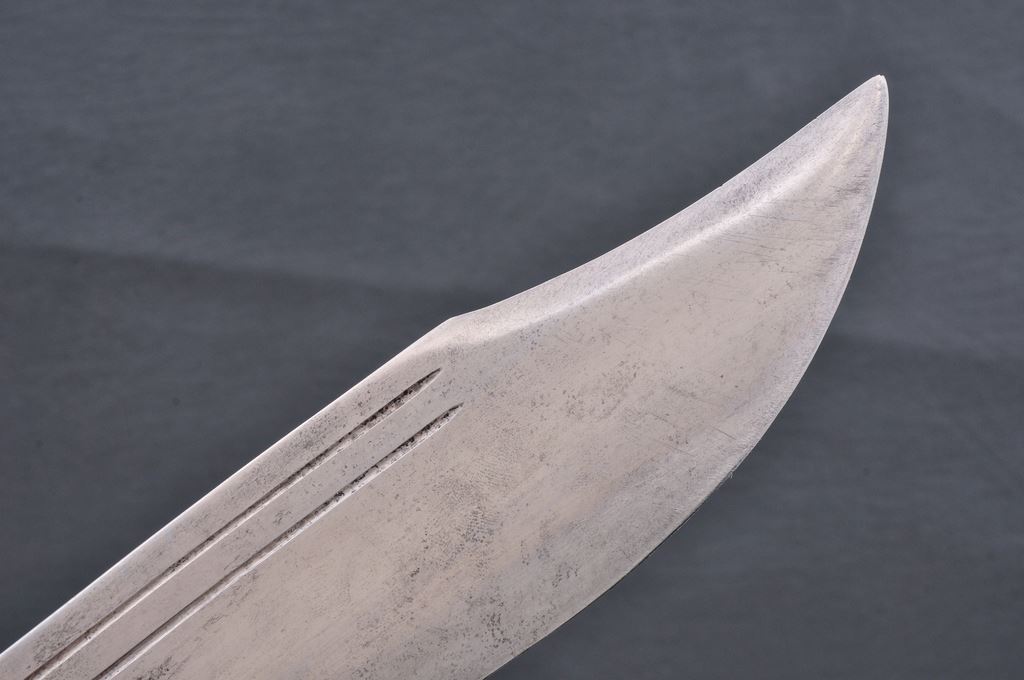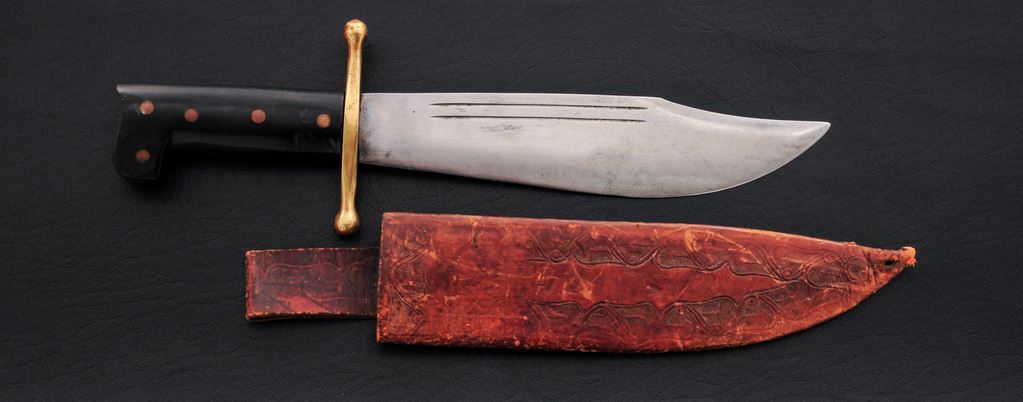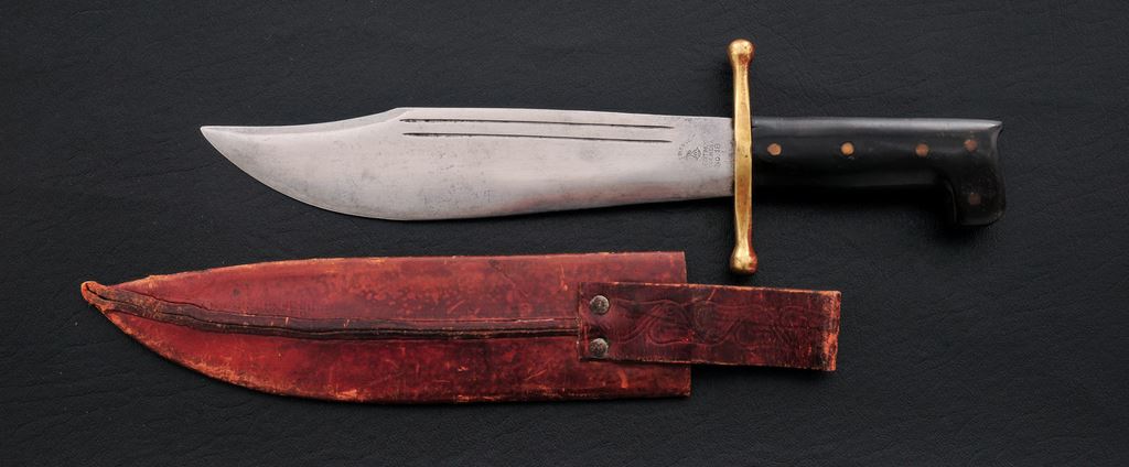 Collins No. 18 V-44 Survival Knife, with the original sheath, 9.5'' clip point blade, 14-1/8'' overall, full brass guard, with black composition handle. Blade with standard Collins ''Legitimus'' stamp. The tooled brown leather sheath also with Collins ''Legitimus'' stamp to the front side. Overall this knife is in very good condition showing honest moderate age and wear. Blade shows additional sharpening; maker's marks are just a little worn on the left edge. Handle and guard show age and wear consistent with the overall condition of the knife and sheath, including surface nicks and scratches. Sheath with general surface scuffs and a half-inch perforation near the tip; stamp is worn but still legible. Est.: $200-$400. (Joe Poyer collection)