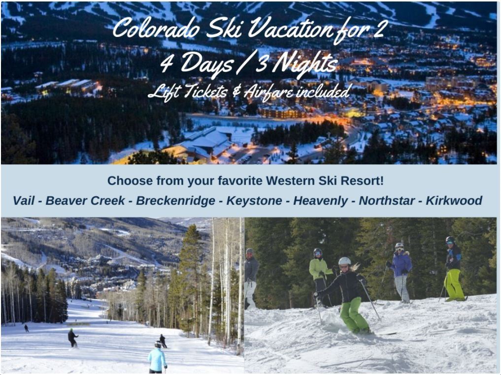 Colorado- The Western Ski Experience. Purchase your next vacation to go skiing in Colorado for 4 days and 3 nights. Choose from 7 of the best ski resorts and enjoy round trip airfare for two. 4-Days/3-Nights Deluxe Hotel in your destination Resort Community. Choose your Premier Ski Resort: Vail, Beaver Creek, Breckenridge, Keystone, Heavenly, Northstar, Kirkwood. 3-Day lift tickets for two (2) • Round Trip Coach Class service for two from within the US/48