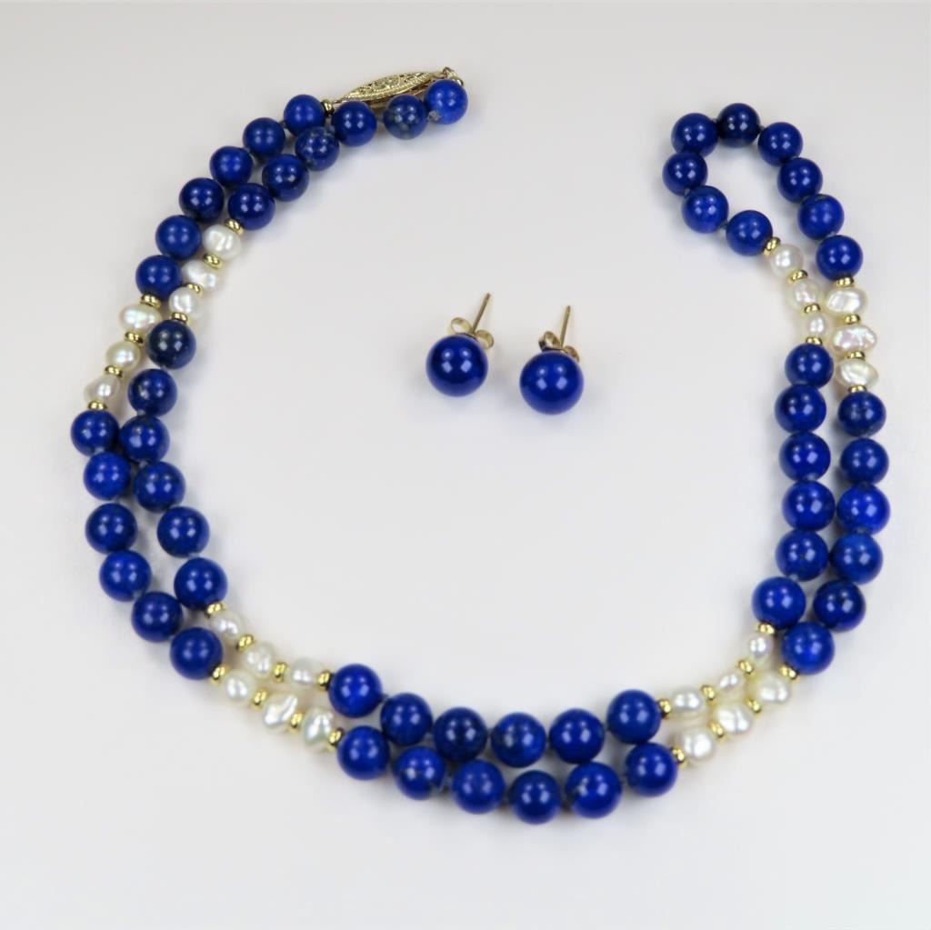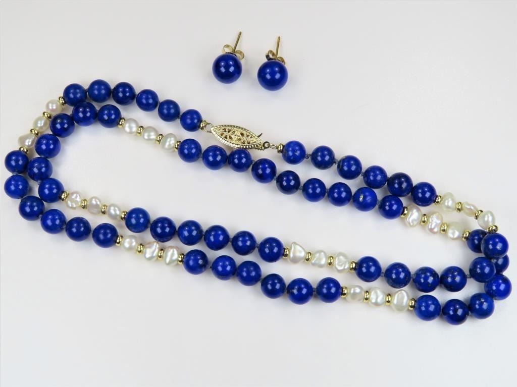 Lazuli Beads with Matching Lapis Earrings accented with 14 karat gold latch and backs on earrings.