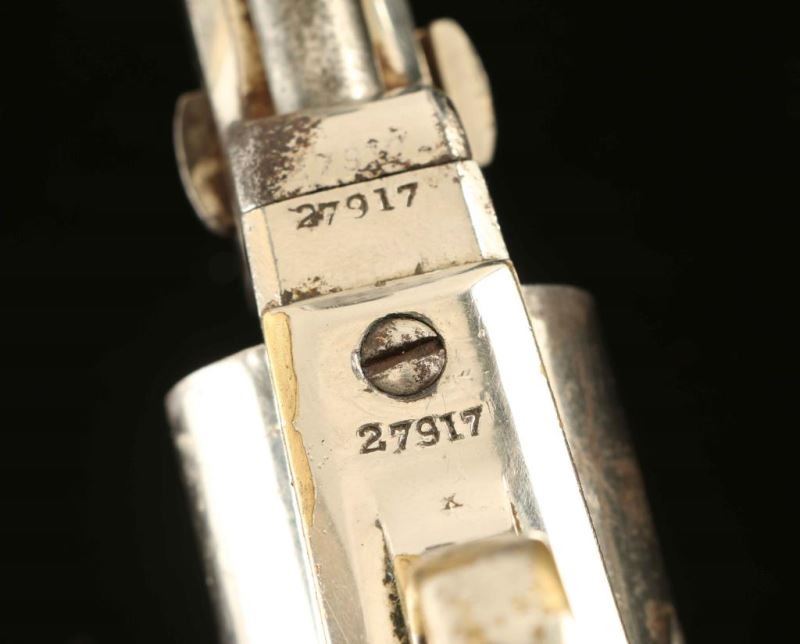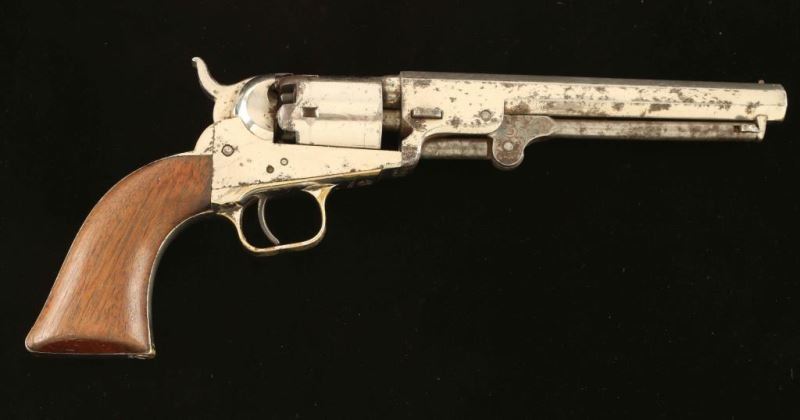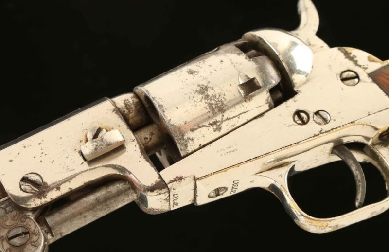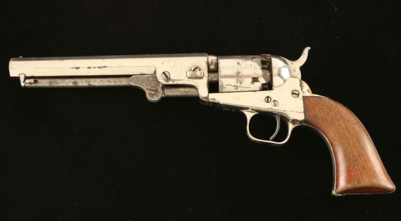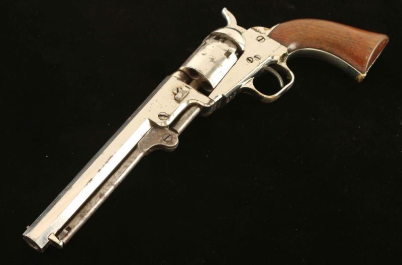 Antique single action five-shot percussion revolver cambered for .31 caliber ammunition, circa 1852. Features a nickel plated refinish, 6" octagon barrel with "Address SamL Colt/New York City" two line address, post front sight, 'v' notched rear sight on the hammer, non-fluted cylinder with roll stamped stagecoach holdup scene, scroll engraved case hardened loading lever, smooth trigger, knurled hammer spur, and one-piece varnished walnut grip. Markings are faint but legible, cylinder scene is no longer visible and all serial numbers are matching with the exception of the loading lever. Revolver retains approximately 80% of it's nickel plated refinish showing flaking and scattered rust, primarily on the right side. Action performs well. nipples are all damaged, bore is fair, and the wood grip is very good with little finish remaining. Condition is NRA good. ***Antique Firearm***