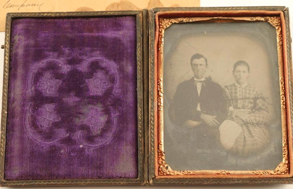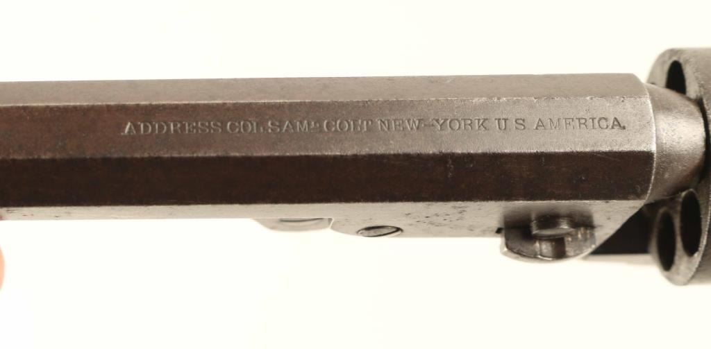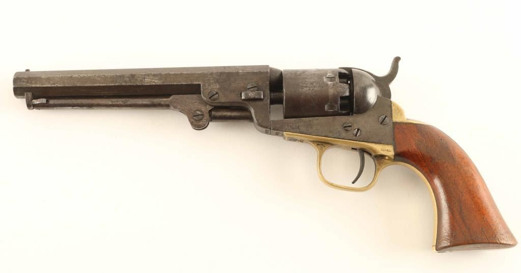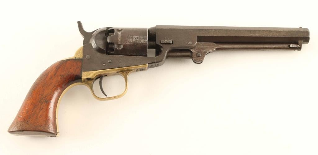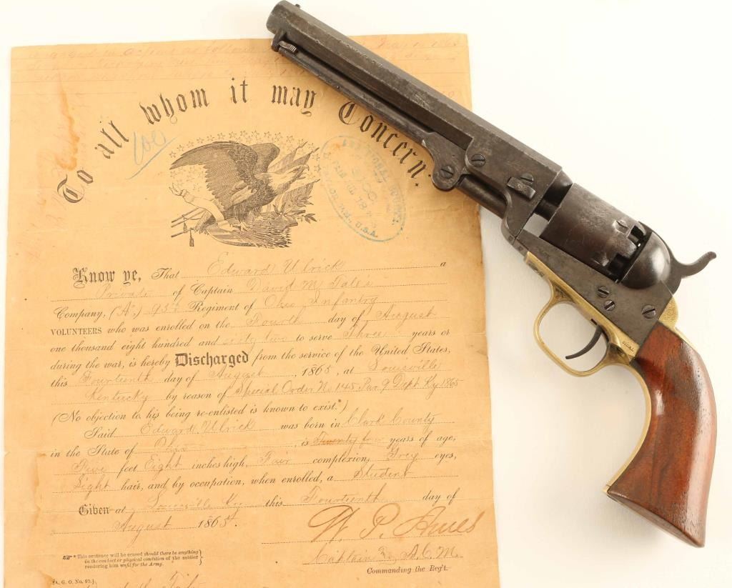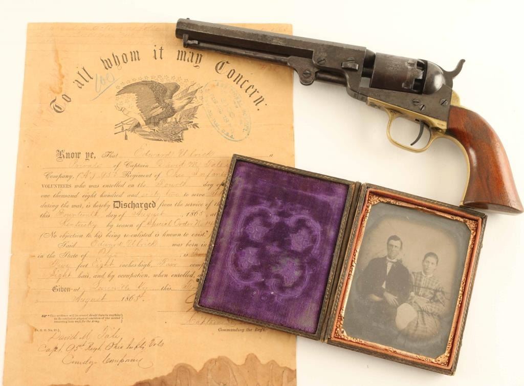 Ensemble consisting of 1849 Colt pocket model with a 6” barrel, tin type of man and wife, and Civil War discharge of Edward Ulrich from David M. Tate’s company of 95th Ohio volunteers at Louisville. This pocket model remains in good to very good condition with traces of finish with good visible markings. Matching visible numbers and 30%+ light cylinder scene remaining. The grips show 60%-70% varnish and are very good overall with minor wear and natural aging. The action works but no half cock and minor pitting and erosion. Loading lever latch is an old period replacement. 1 line New York address with six shot cylinder. Made in 1863 during the height of the Civil War. This pocket model and effects displayed in case together by old collector and we cannot prove any association other than they are of the same era and it is possible to have descended together. Condition is NRA Good++ ****Antique Firearm****