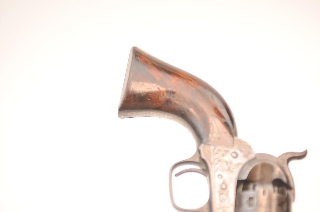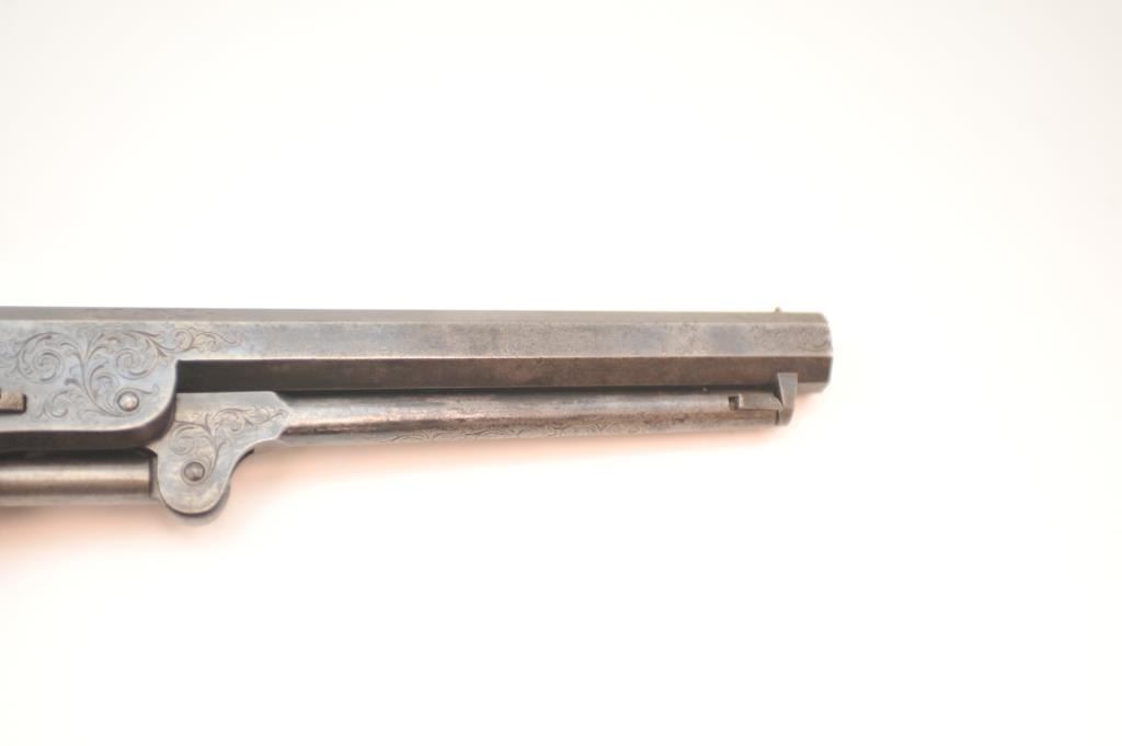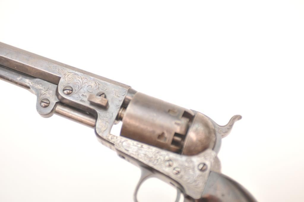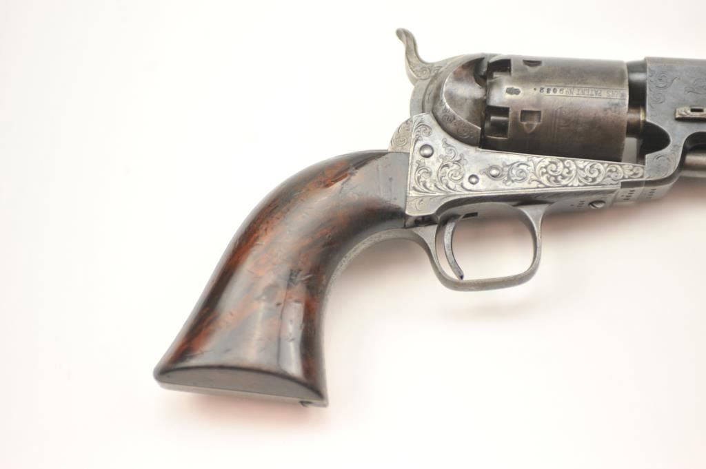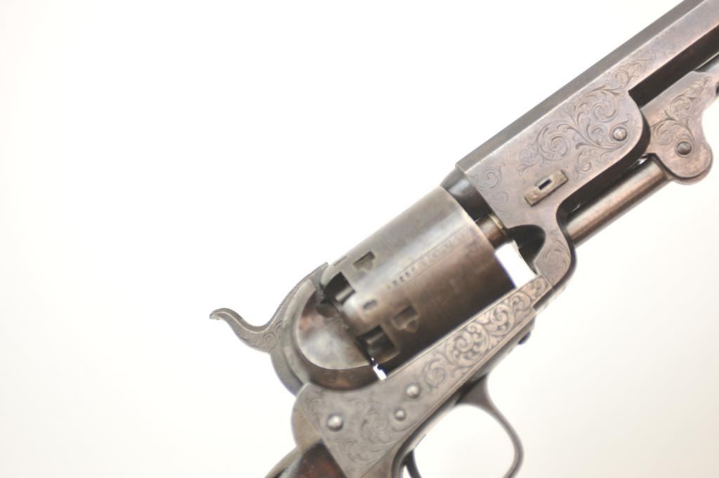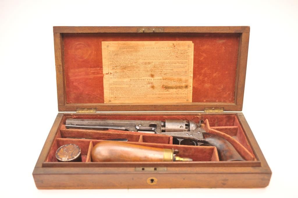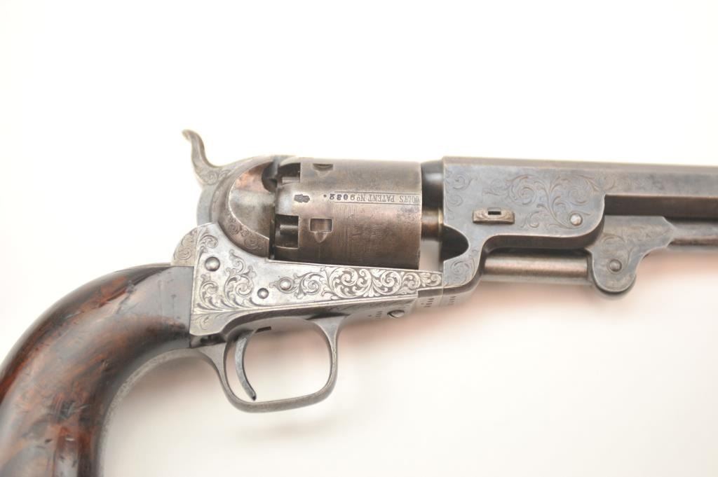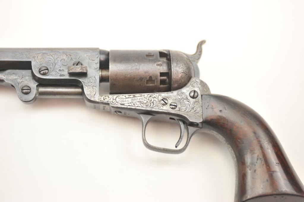 Colt 1851 London Navy .36 caliber percussion revolver, factory engraved in the original case, Serial #2032. In original good to very good condition showing 30-50% original blue on the barrel with visible case color withina light grey patina on the frame. The cylinder shows 50% plus thinning and toning blue with most of the original cylinder scene and Ormsby signature slightly light but visible. There are minor areas of pittingnear the end of the barrel. The grips are deluxe burl wood showing 50-70% of the original varnish and just normal aging and loss of finish. The grips fit impeccably. All matching with sharp markings, crispaction and all six safety pins retained. The engraving is typical London style with a hand cut Colt’s Patent in banner on the left side of the frame. The English style partition case is lined in red velveteen andshows an authentic instruction label. Includes a Bartram and Company bag flask in very good condition, along with a mold and wrench showing 75% plus bright blue, and a cap tin with no label. No compartment cover