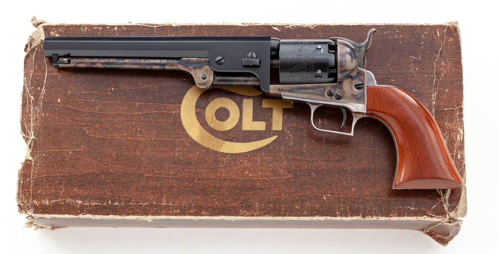 Colt 1851 Navy 2nd Generation Percussion Revolver, #22160, .36 cal., 7.5'' barrel, blue and case hardened finish, silver-plated backstrap and squareback triggerguard, with smooth walnut grips. In a simulated woodgrain Colt box (missing both end flaps), with styrofoam insert and instructions. Mfg'd 1976. Condition is excellent, appearing as new. Only a portion of the cylinder shows an extremely faint index line. Silver-plated parts with mild toning. Grips and bore are as new. Box shows age and wear. Est.: $500-$700. (No FFL Required)