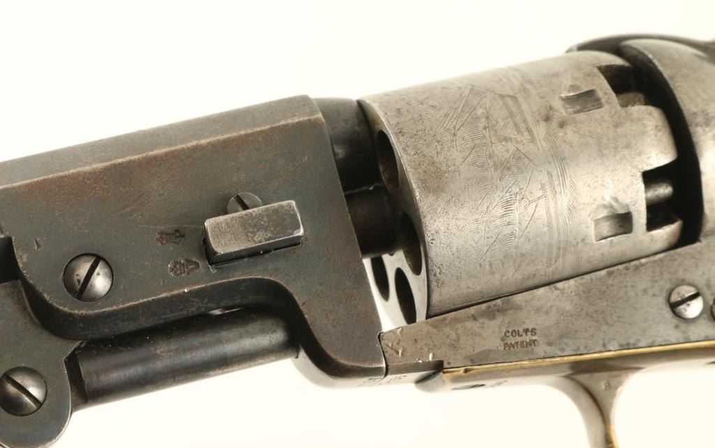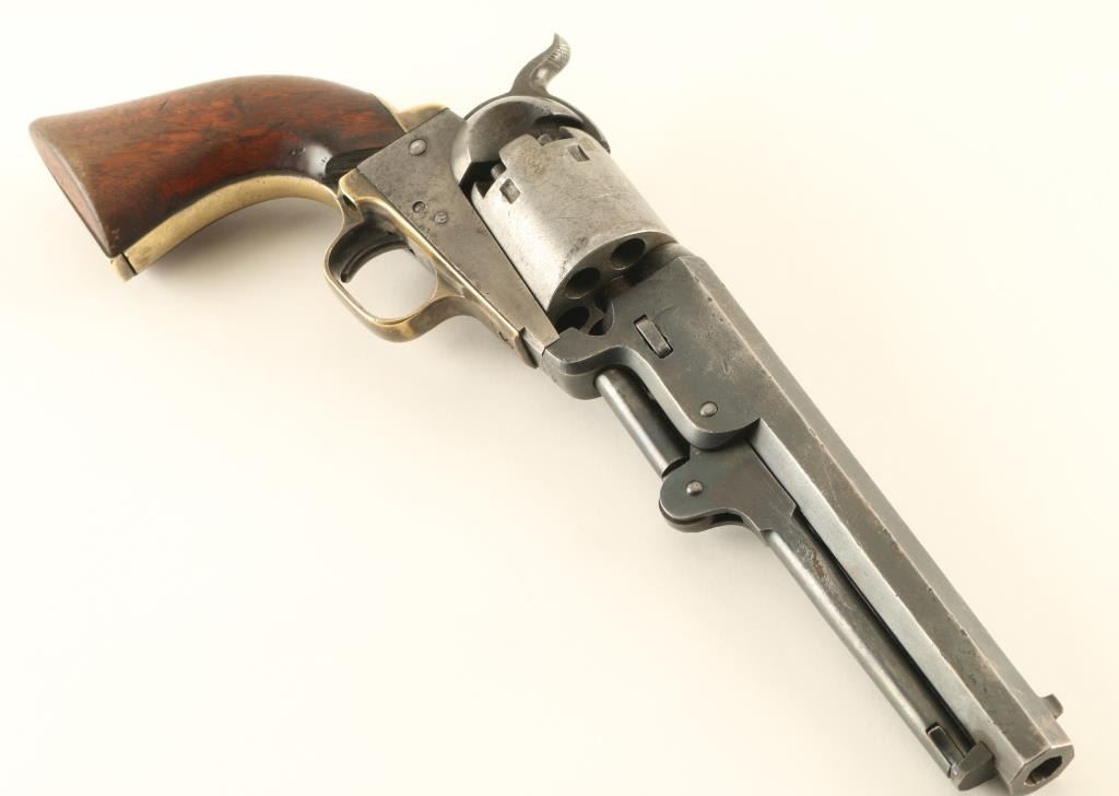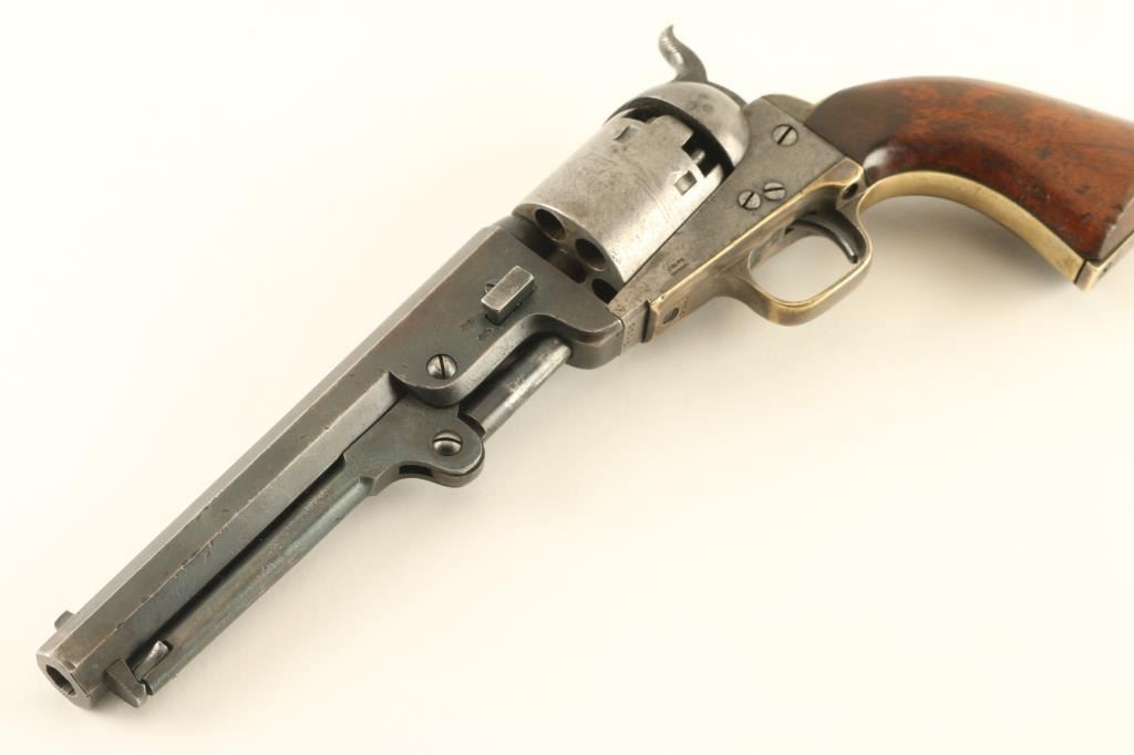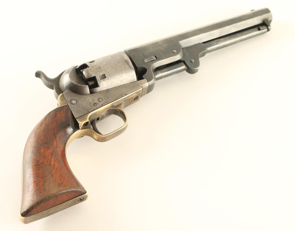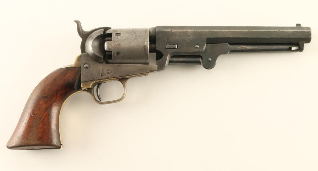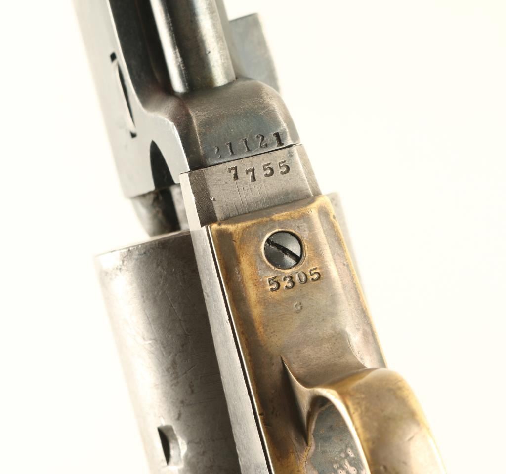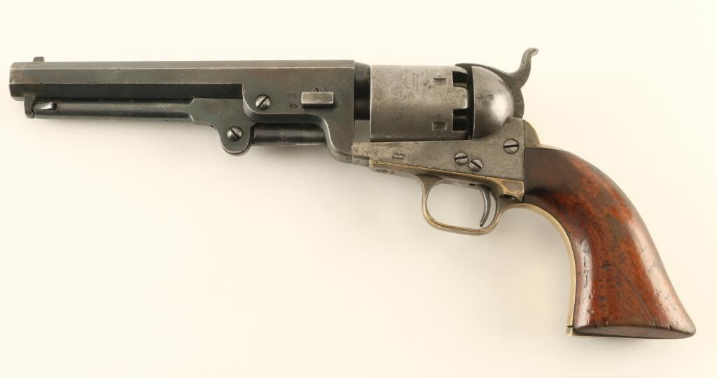Single action percussion cap 'n' ball revolver features 6-1/4" octagonal barrel, blade front sight in dovetail, rear sight on hammer nose, loading lever under barrel. Bore is fair condition, with strong rifling, dark grooves and light pitting. Charge holes are dark, fairly smooth, old powder fouling present. Barrel assembly retains 70% blue, gray colored near muzzle, bare metal and denting on edges. Cylinder shows a thin light gray color, some sailing ship cylinder scene visible. Frame is silvery gray, slightly mottled, with slight peening to upper edges. Brass backstrap and trigger guard are good condition with darker patina and some verdigris. Screws slots mostly good with little marring. Wood grips are good condition, some shrinkage and many small nicks and dents, bare wood at high spots where finish has worn off. Action operates smoothly and locks up fairly tight. Markings include "ADDRESS COL COLT LONDON" on barrel top, crown over "V" and crown over "P" proofs on barrel left, "COLTS PATENT" on receiver left, "..LTS PATENT NO" ("COLTS" missing "CO") on cylinder. Barrel assembly numbered "21121", trigger guard and backstrap both marked "5305". Condition is NRA Very Good *** Antique Firearm ***