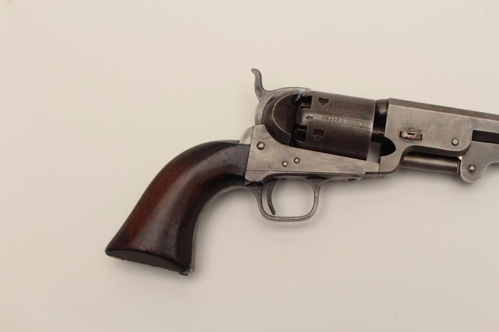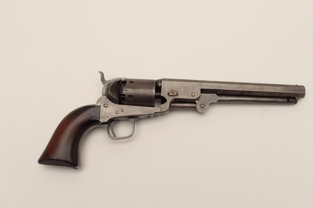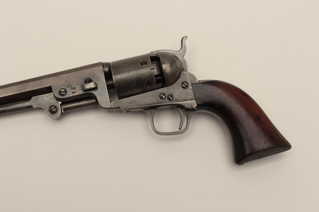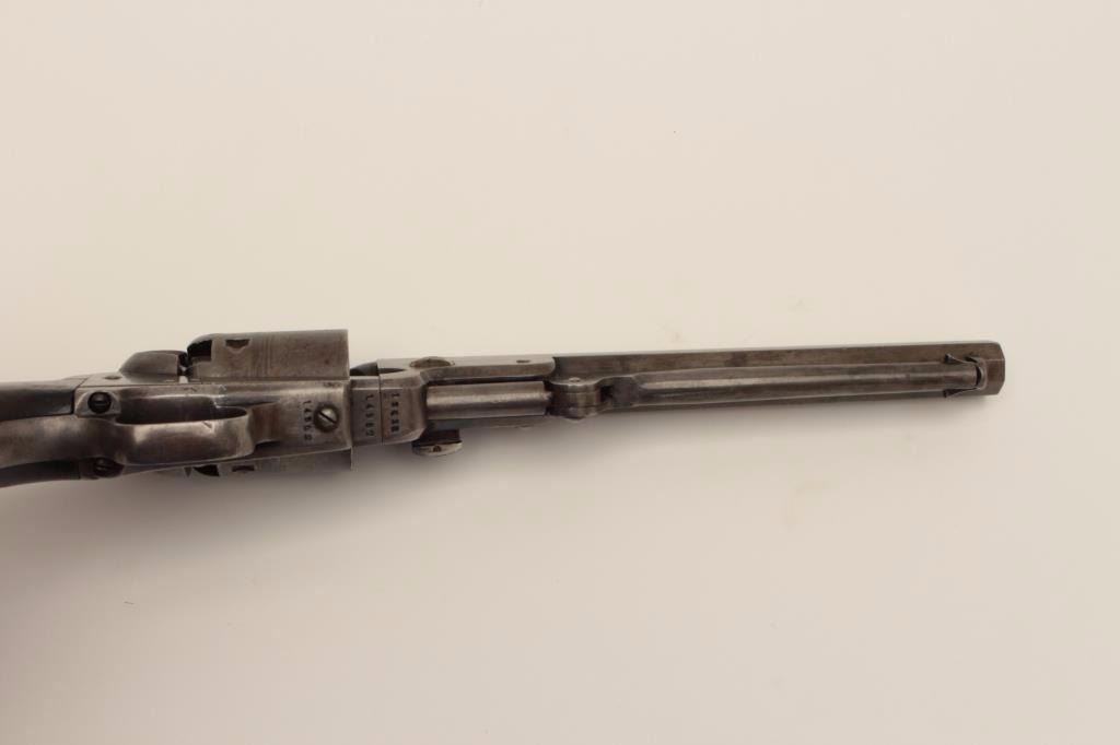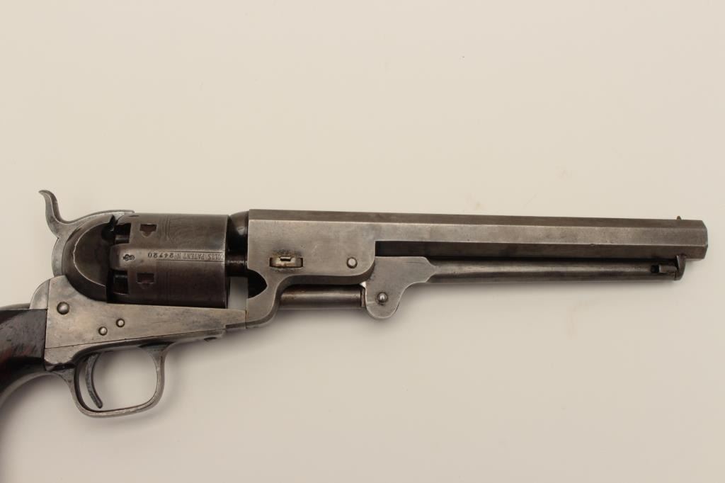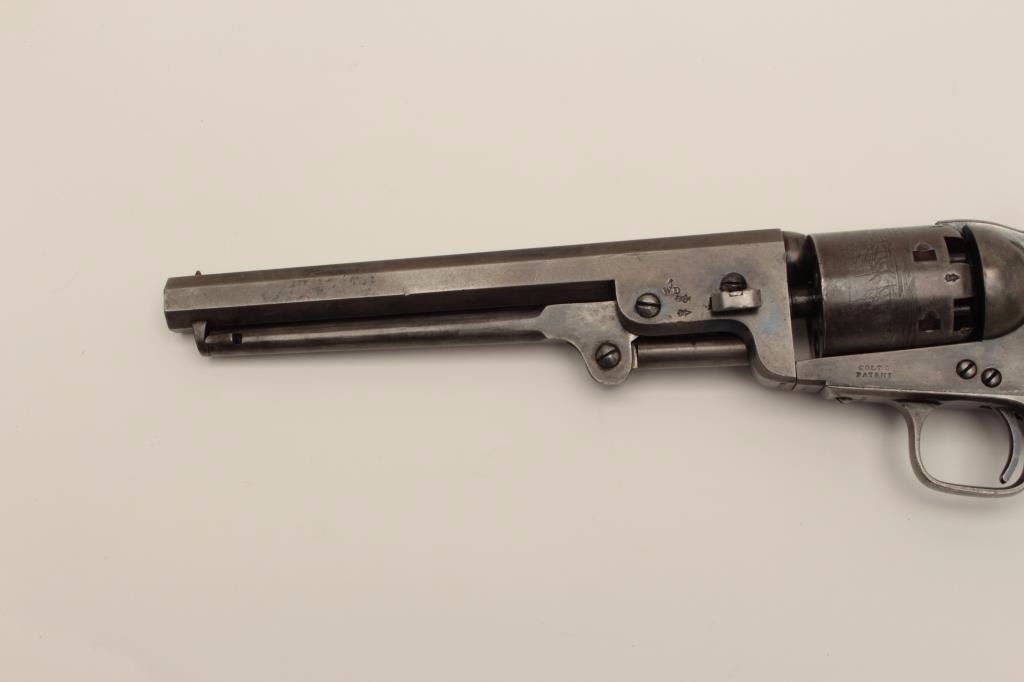 Colt 1851 Navy .36 caliber percussion revolver, S/N 14952 with London address, iron guard, British proofs and desirable W.D. marking with broad head proof indicating issue to the Military forces at the period of Crimean War and “The Charge of the Light Brigade”. This revolver remains in very good plus condition with 10%-15% original blue nicely drifting to a natural light gray patina. Very sharp and crisp withwell-defined markings. 40%-60% original cylinder scene with Ornsby signature and engagement dates legible. The barrel and rammer are numbered 18638 and the frame, trigger guard and backstrap are numbered14952. The cylinder is numbered 24720. The condition and fit is indicative to be arsenal or field assembly for military re-issue. A very nice martial though mis-matched. (Antique) Est.: $1750-$3500