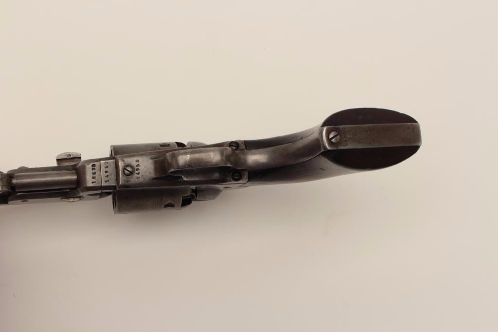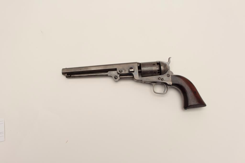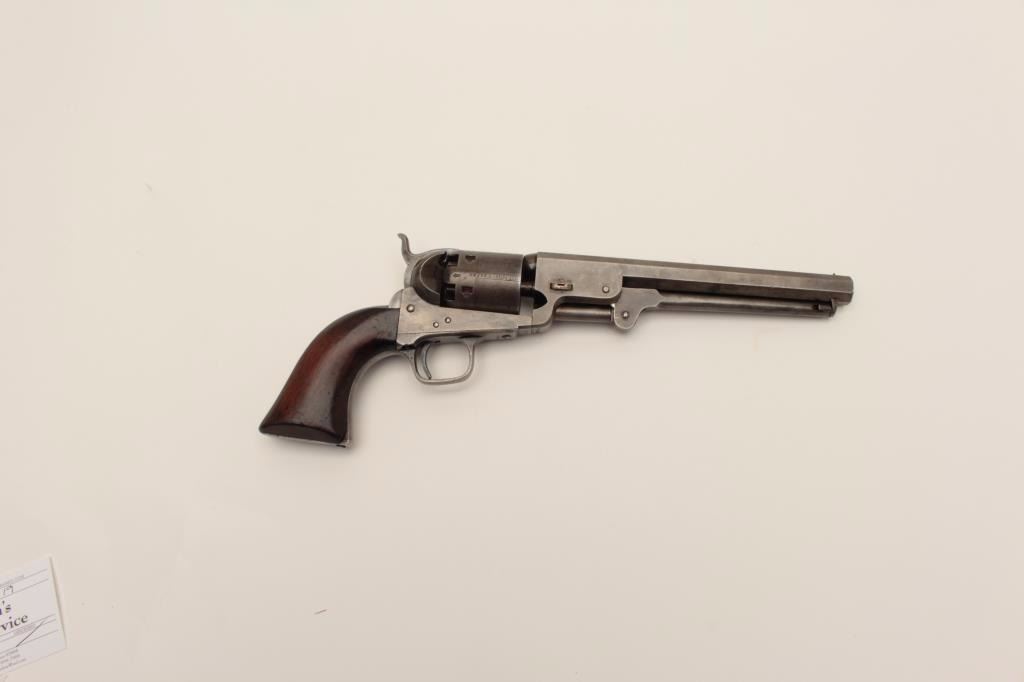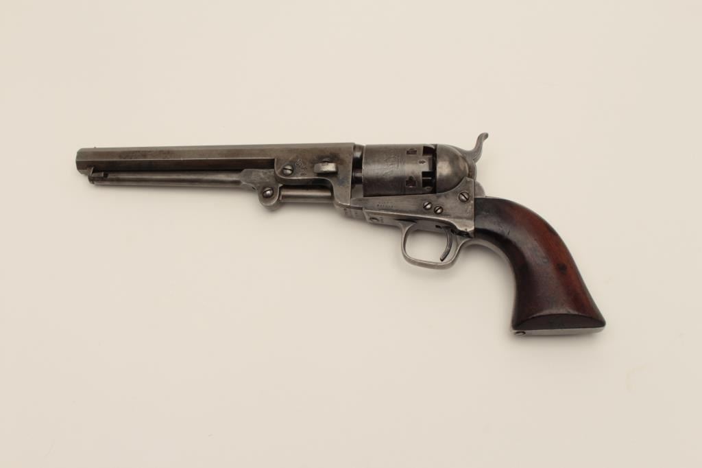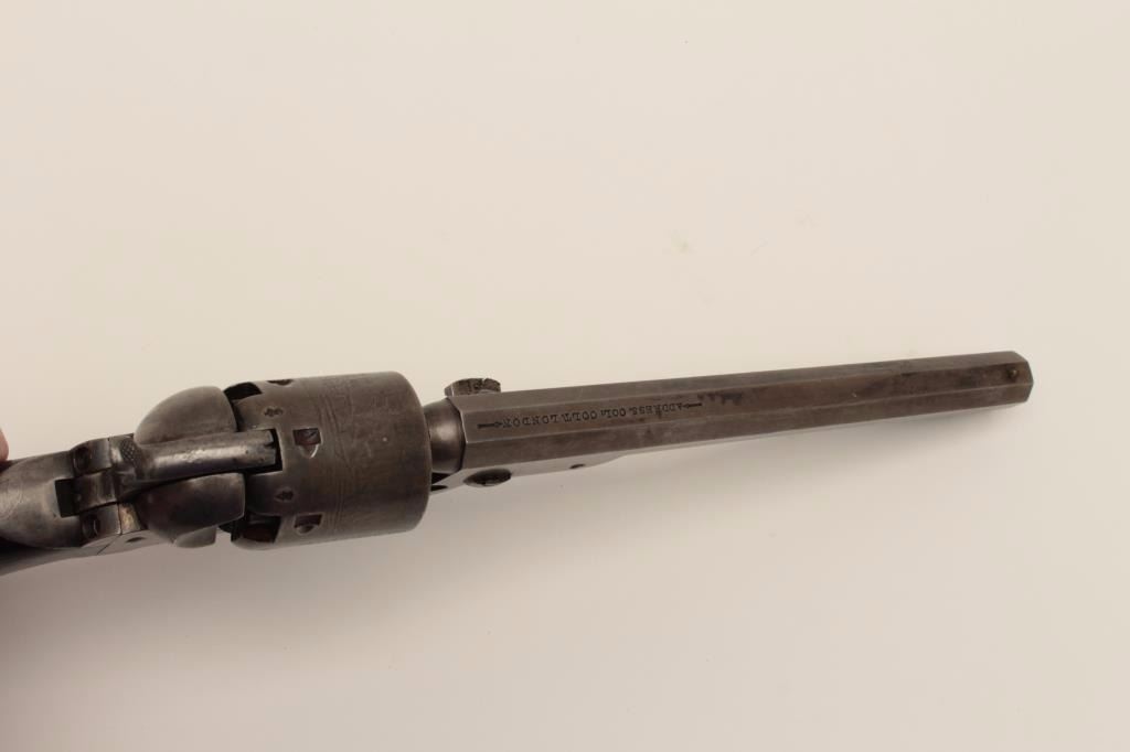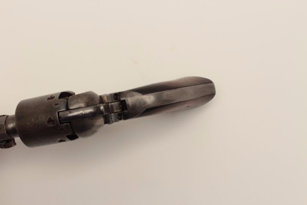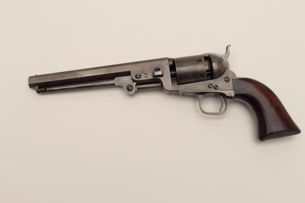 Colt 1851 Navy .36 caliber percussion revolver, S/N 14952 with London address, iron guard, British proofs and desirable W.D. marking with broad head proof indicating issue to the Military forces at the period of Crimean War and “The Charge of the Light Brigade”. This revolver remains in very good plus condition with 10%-15% original blue nicely drifting to a natural light gray patina. Very sharp and crisp withwell-defined markings. 40%-60% original cylinder scene with Ornsby signature and engagement dates legible. The barrel and rammer are numbered 18638 and the frame, trigger guard and backstrap are numbered14952. The cylinder is numbered 24720. The condition and fit is indicative to be arsenal or field assembly for military re-issue. A very nice martial though mis-matched. (Antique) Est.: $1750-$3500