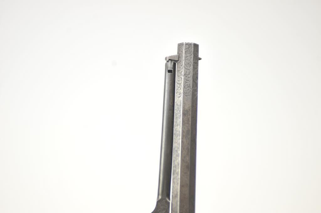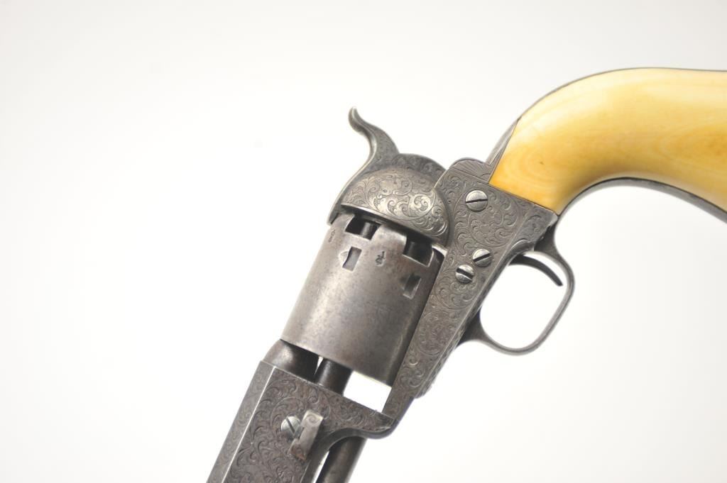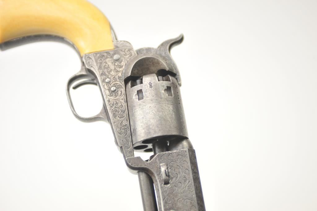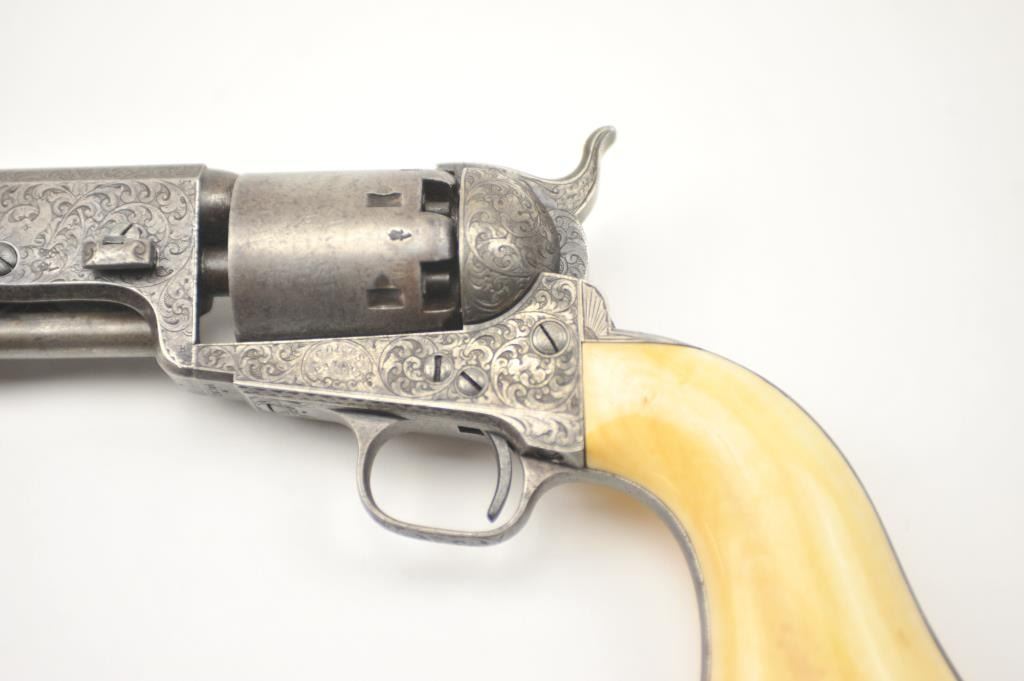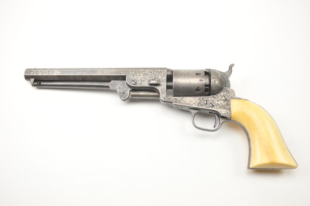 Colt 1851 Navy Percussion revolver in .36 caliber fully and deluxe Gustave Young engraved with New York address, small iron trigger guard and back strap, London proofs, S/N 28306. The barrel proofs are overengraving indicating shipment to Britain. The engraving is that of the master’s own hand with extra treatment at the muzzle, tight and elaborate scrolls with “Devil Dog” hand cut Colt’s patent at the center of the frame, cob webs, florals and “a bit extra” engraving than normally encountered. The Colt shows original ivory grips that fit impeccably with yellowing and the right amount of natural aging. The revolver is very good overall with crisp metal surfaces and generous traces of blue and case hardening mixed with a natural patina. 30%-50% light original cylinder scene with visible Ornsby signature. Good address and markings. Crisp edges. Tight action andmatching visible serial numbers. A scarce variation being a New York iron guard engraved that old collector’s feel about 6-12 exist. Gary Wiemann collection. Est.: $6,000-$12,000