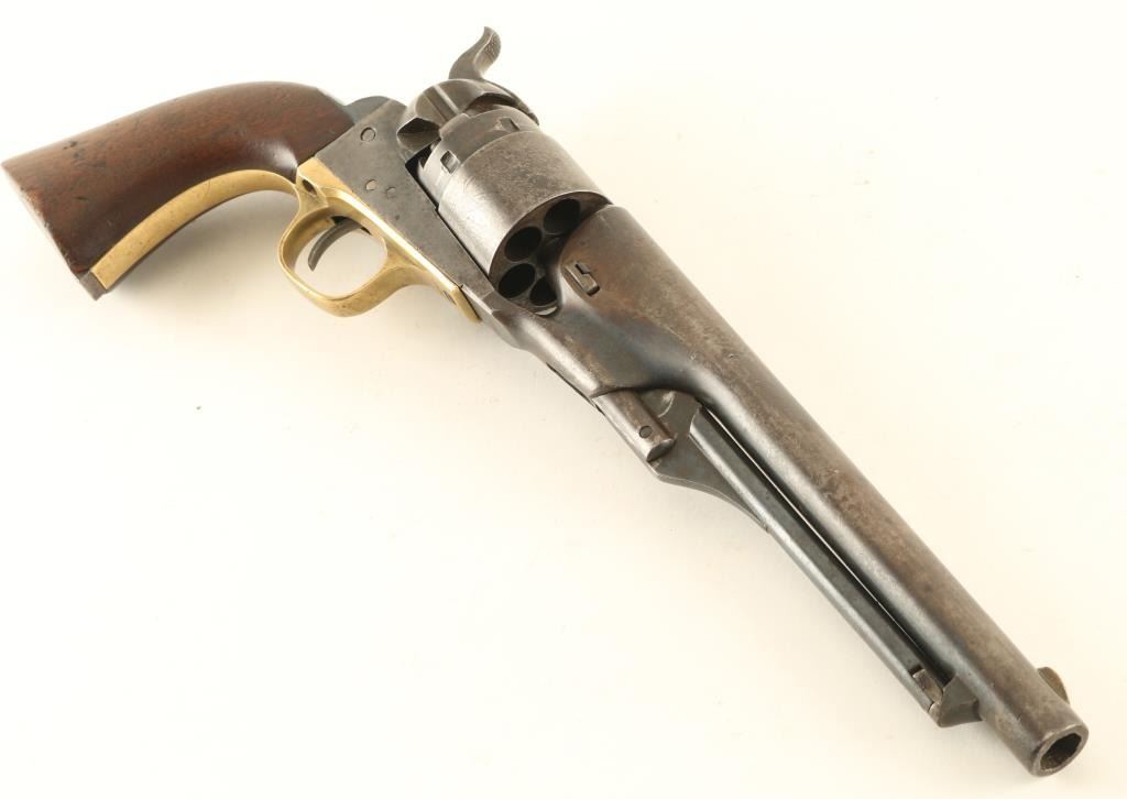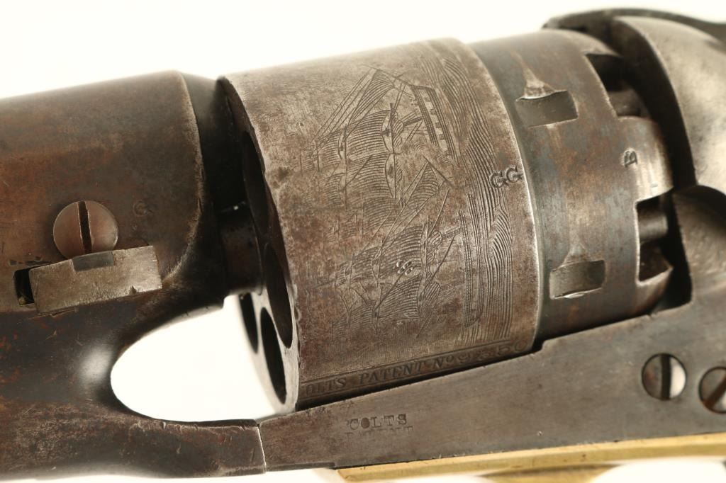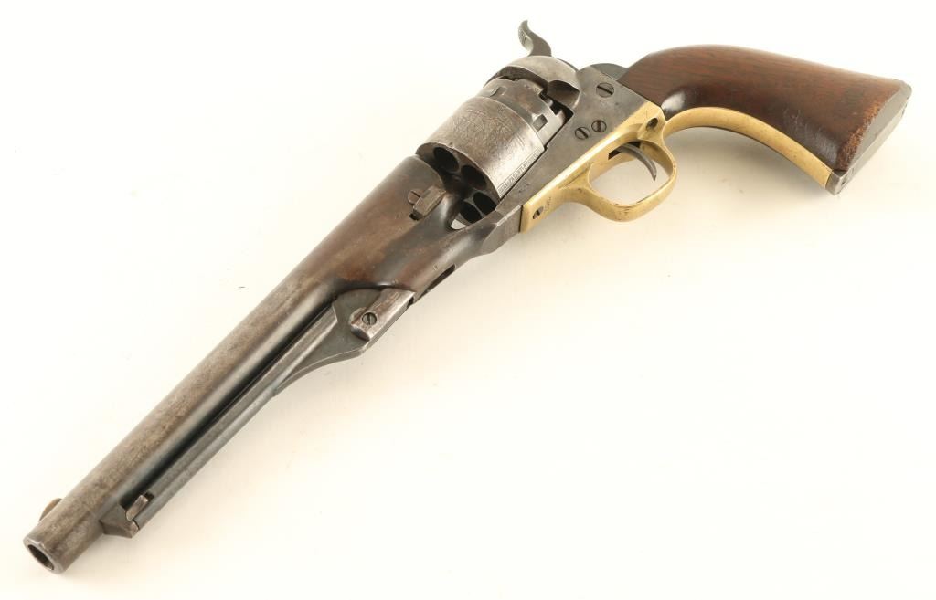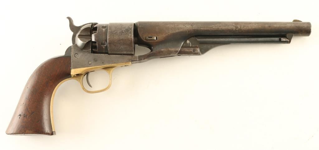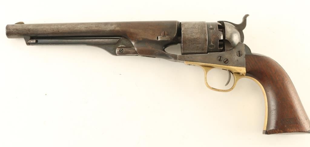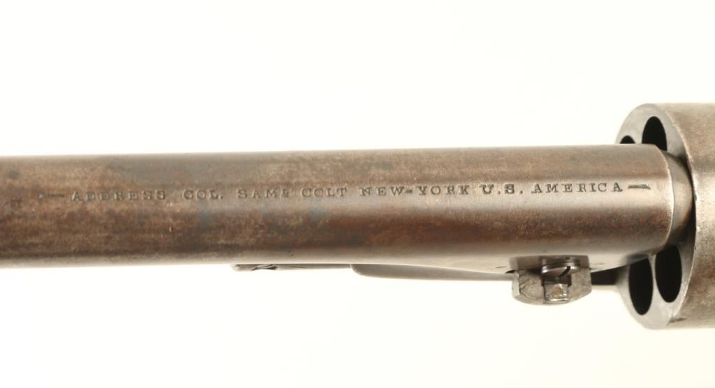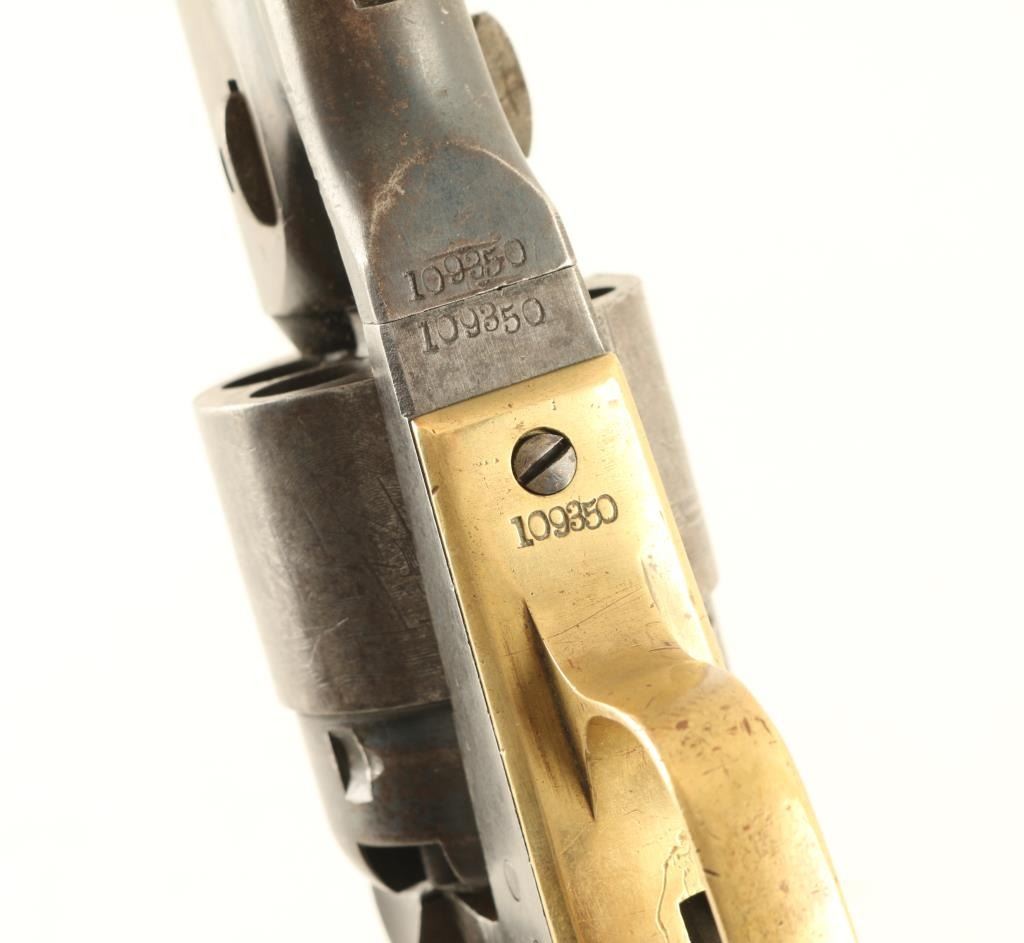 U.S. Martial marked in very good plus original condition, S/N 109850 issued during Civil War. Approximately 30%-50% toned original finish with all matching serial numbers. Most cylinder scene remains and crisp original grips with fully visible cartouche. Small losses to toe of grips. Sharp markings and crisp overall. A very nice example and a strong 8 on a 1-10 scale that would be expensive to upgrade. Condition is NRA Good ****Antique Firearm****