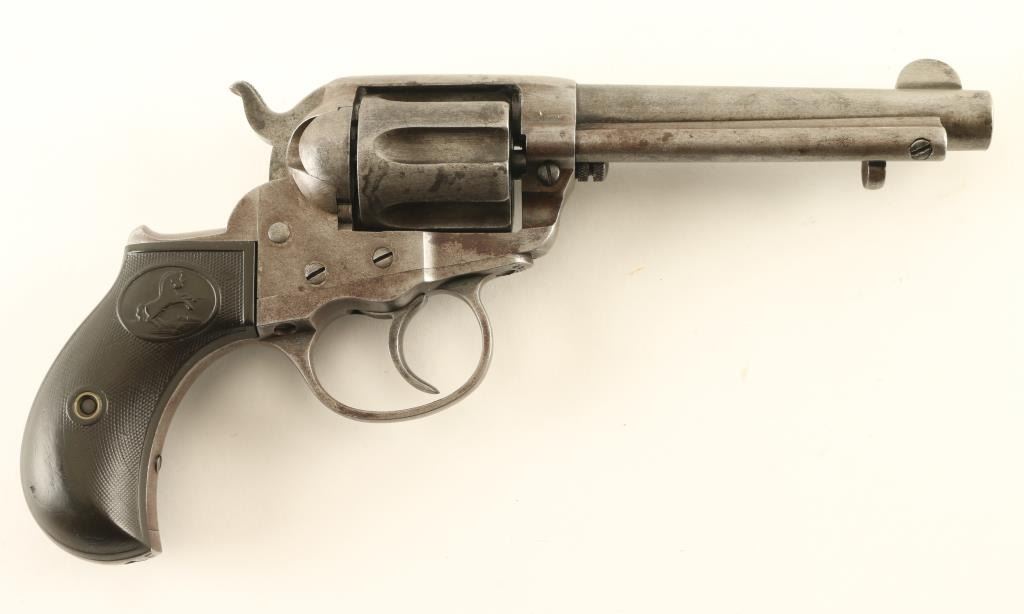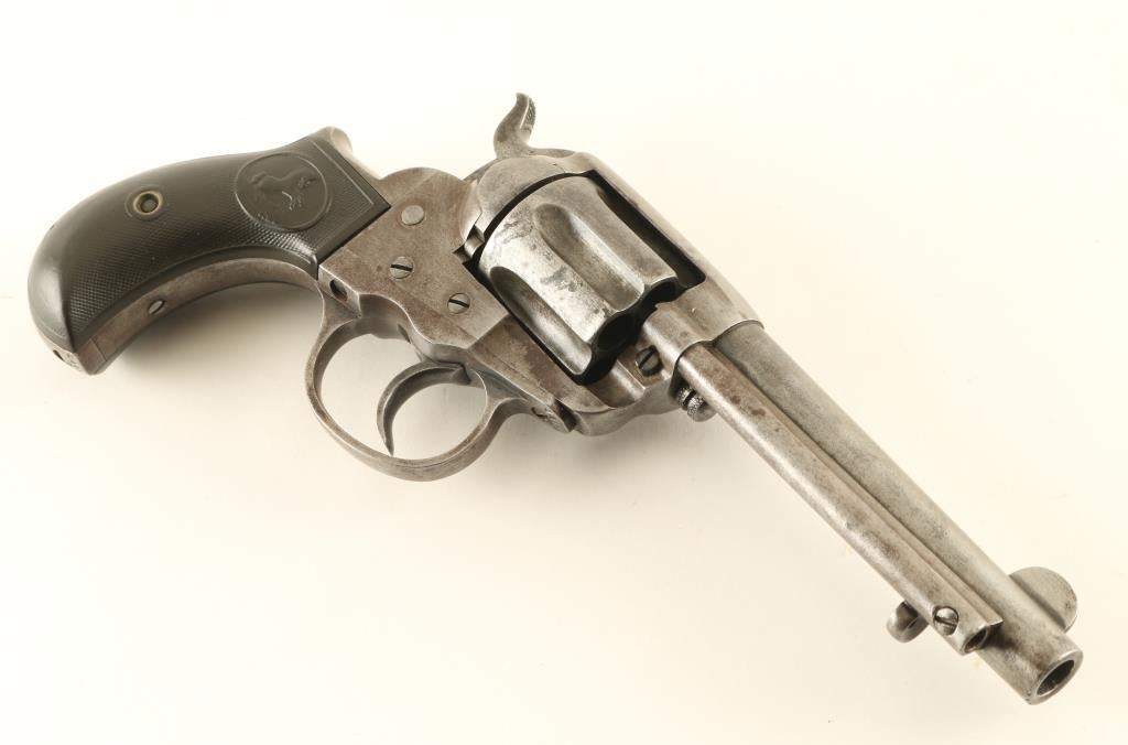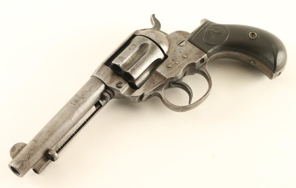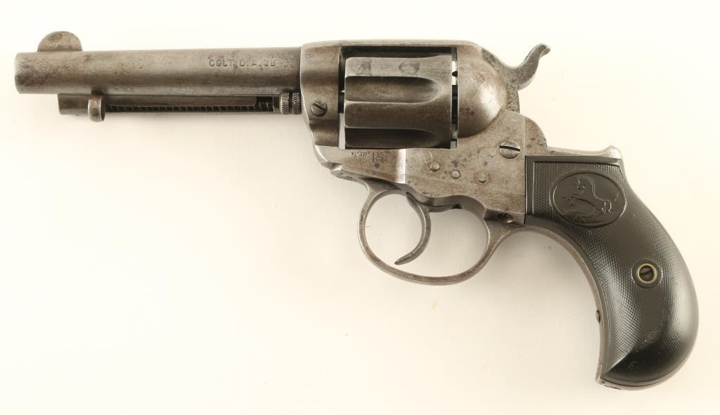 Double/single action revolver manufactured circa 1900. Features blued finish, checkered black gutta percha grips with Rampant Colt horse emblem, bird's head grip frame, 4.5" barrel with ejector rod, fixed sights. Bore is bright, good condition rifling, some evidence of light pitting. Charge holes are good condition, visible residue from firing. Metal parts are a fairly even light gray color, with some darker spots from pitting or patina, darker brownish color found in protected areas such as cylinder flutes. Grips are good condition with no visible cracks, slight smoothing of Colt emblems. Single action operation is smooth, with tight lock-up. Double action operation operates hammer but cylinder does not rotate fully (or at all) and does not lock-up. Numbers on triggerguard and back strap match frame. Two line barrel address. All markings are fairly crisp. Rampant Colt on left side of frame is lightly eroded but clearly visible, surrounding circle is mostly eroded. Condition is NRA Good *** Antique Firearm ***