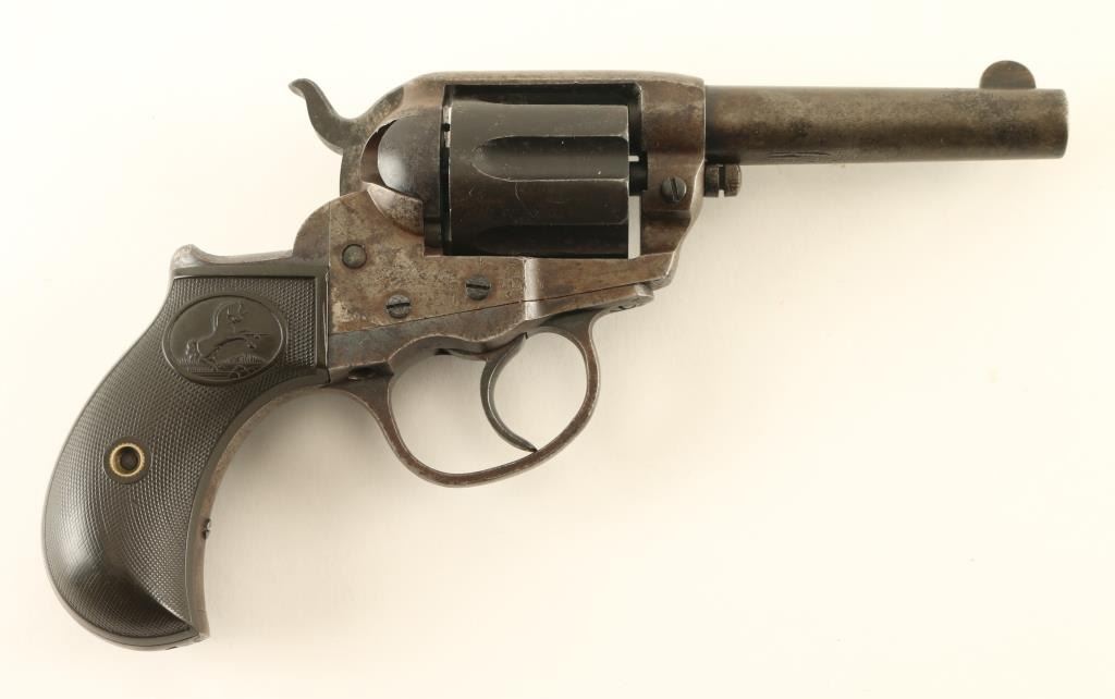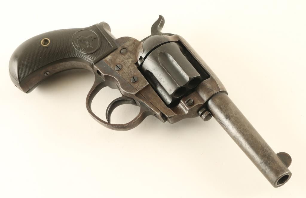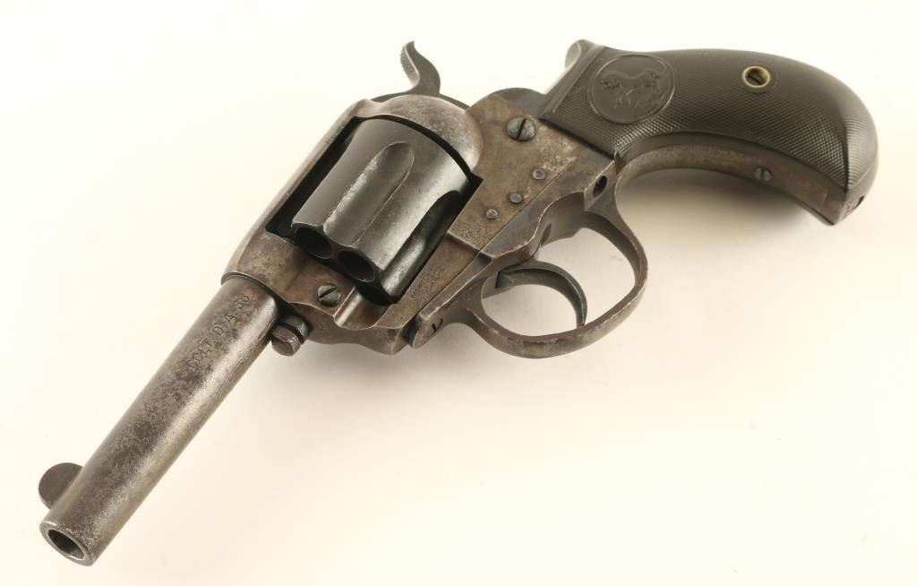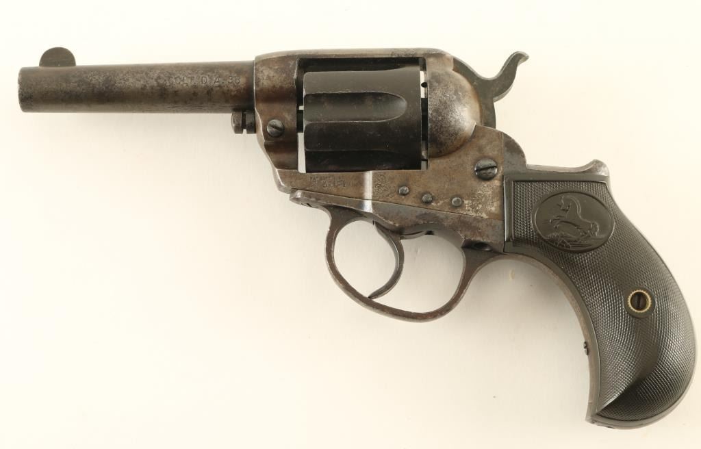 Double/single action revolver manufactured circa 1905. Features blued finish, checkered black gutta percha grips with Rampant Colt horse emblem, bird's head grip frame, 3.5" barrel, no ejector rod, fixed sights. Bore is slightly frosted, good condition rifling, some evidence of light pitting. Charge holes are good condition, visible residue from firing. Metal parts are a mottled gray and black, cylinder is mostly black or very dark brown, slight roughness from patina or pitting in many places. Grips are good condition with no visible cracks, slight smoothing of Colt emblems. Single action operation is smooth, with fair lock-up. Double action operation operates smoothly with good lock-up. Numbers on triggerguard and back strap match frame. Two line barrel address. All markings are fairly crisp. Rampant Colt on left side of frame is crisp, surrounding circle is faint. Condition is NRA Good + *** Antique Firearm ***