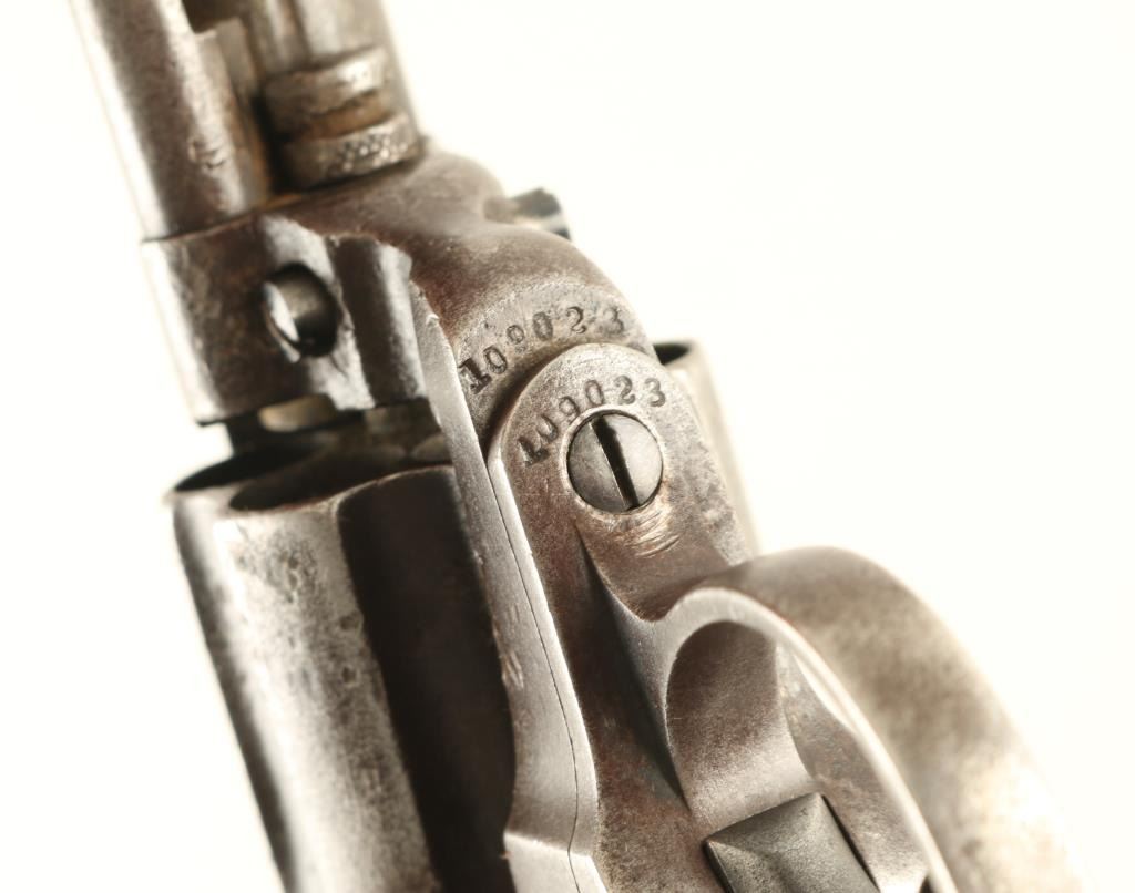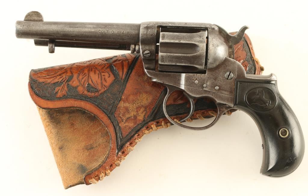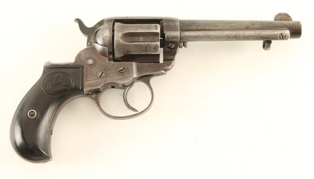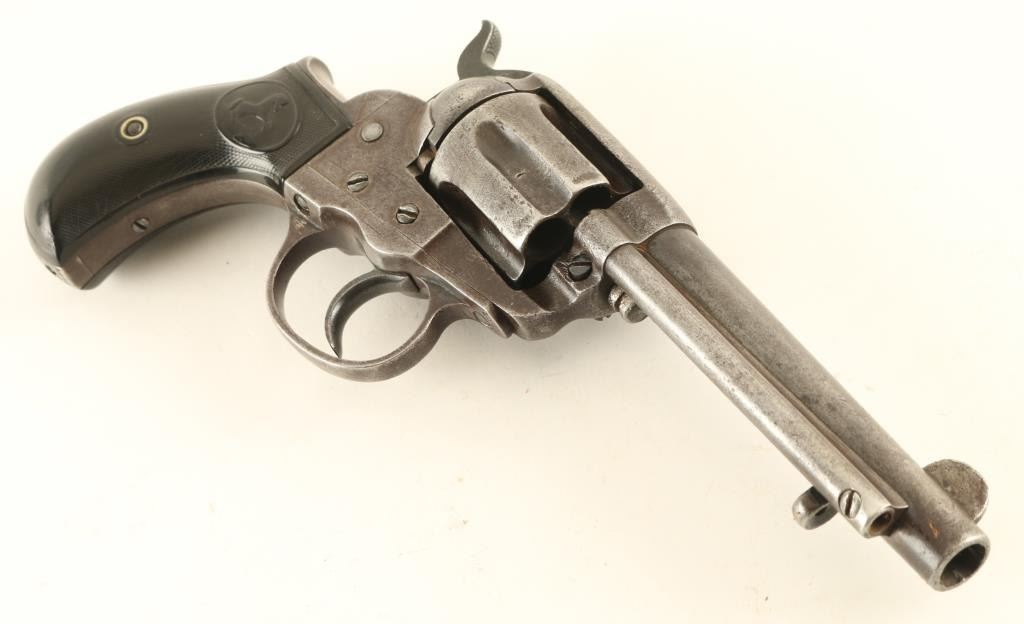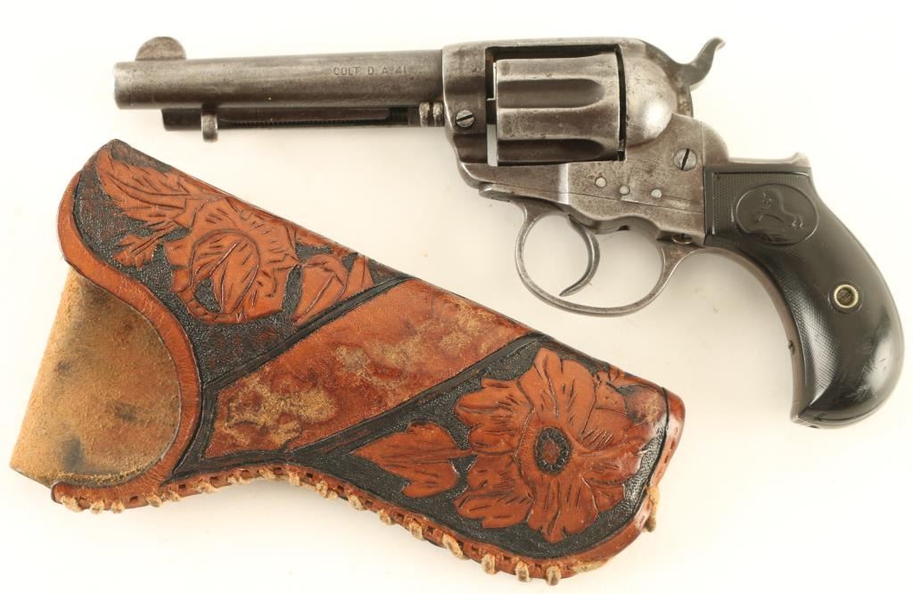 Double/single action revolver features 4.5" barrel, fixed sights, solid frame with side loading gate, bird's head grip frame, checkered dark brown colored gutta percha grips with rampant colt logo. Bore is fair condition, dark with visible rifling. Cylinder charge holes are dark, fair condition. Metal surfaces a covered with a finely mottled patina brown color over silver metal, with small areas of tiny pits all over, impact damage to front sight, row of small dents on barrel near front sight, marred screw slots, dents to cylinder sides. Grips are good condition, worn partly smooth, with scratches and tiny chips, no visible cracks. Action is smooth, slow on timing in single action, good timing in double action, firm lock-up. Numbers match on frame, front & rear grip straps. Loading gate mismatched. Included fair condition floral pattern carved leather holster. Condition is NRA Good *** Antique Firearm ***