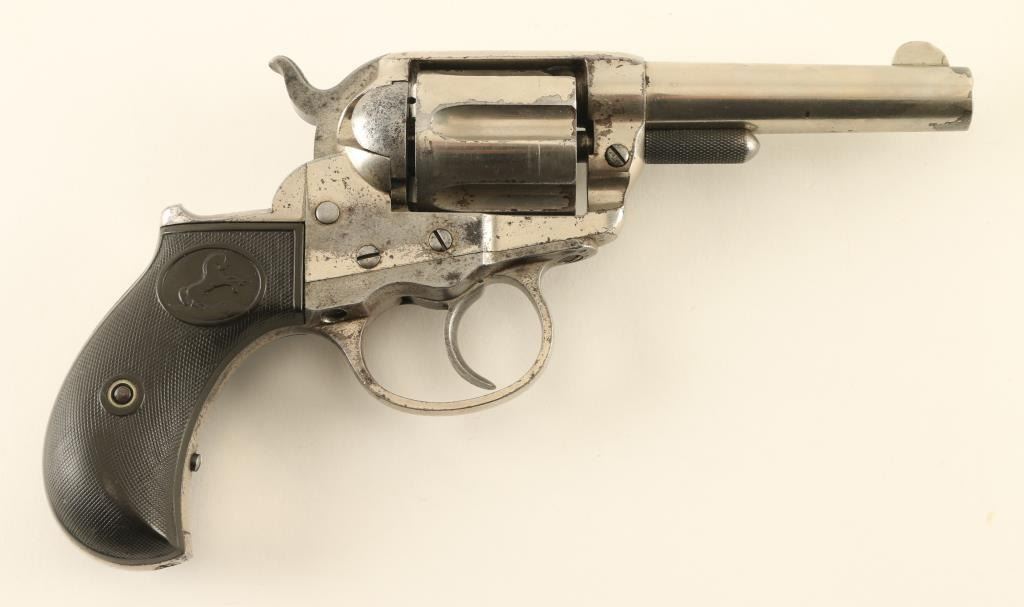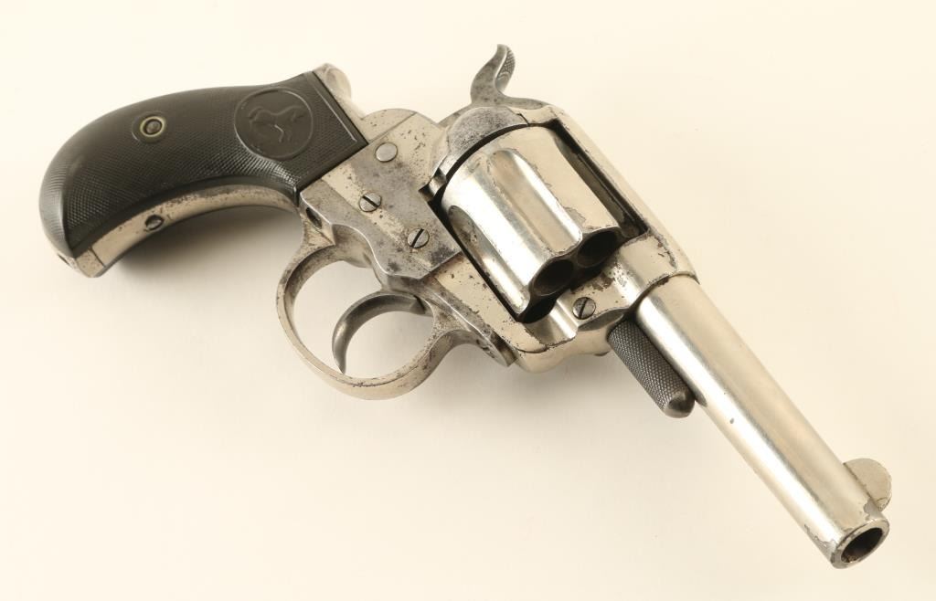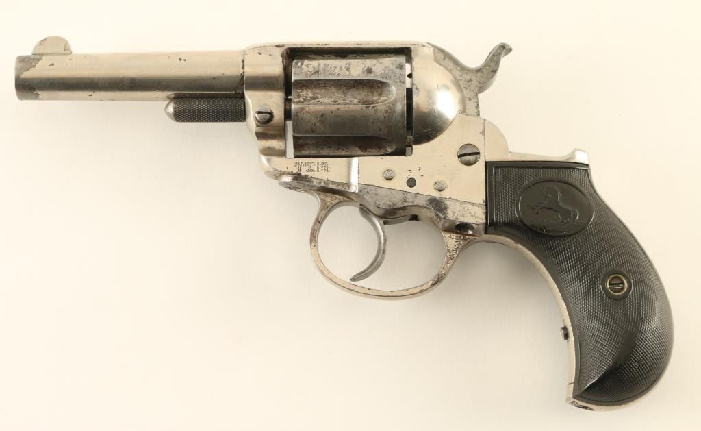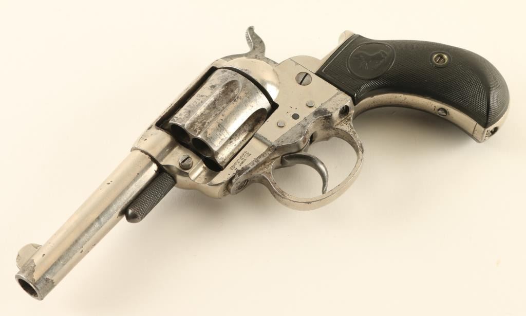 Double/single action revolver manufactured circa 1882. Features nickel finish, checkered black gutta percha grips with Rampant Colt horse emblem, bird's head grip frame, 3.5" barrel, no ejector rod, fixed sights, acid etched caliber marking on barrel. Bore is good condition with tiny shallow pits, good rifling. Charge holes are good condition, visible residue from firing. Retains 60% nickel finish, peeling and cracking with patina brown color showing in a few places, bare metal in others. Back of hammer retains full bright blue. Grips are good condition with no visible cracks, Colt emblems are smoothly worn but clearly visible. Single action operation is smooth with tight lock-up. Double action operation operates hammer but cylinder does not rotate fully and does not lock into position. Numbers on triggerguard and back strap match frame. Two line barrel address and patent markings are fairly crisp, caliber marking is faint. Condition is NRA Good *** Antique Firearm ***