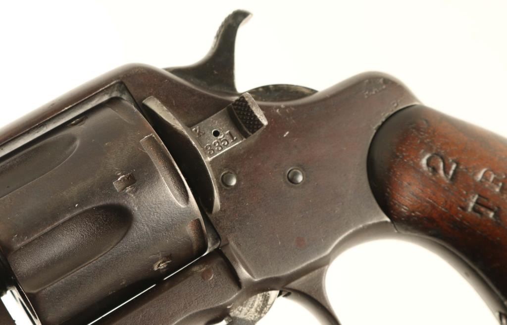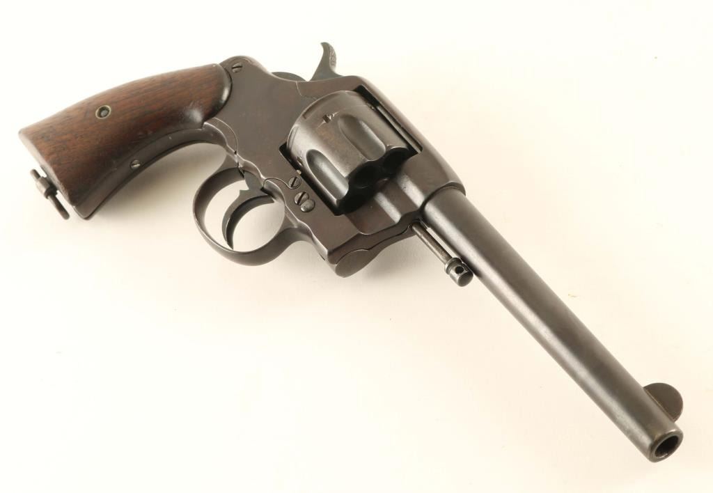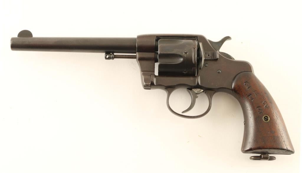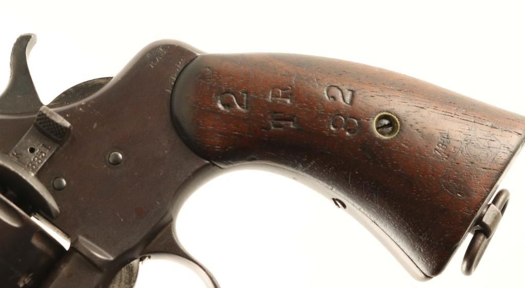 US Military revolver features 6" barrel, fixed sights, swing-out 6 shot cylinder, single/double action, lanyard ring at butt. Bore is fair condition with visible pitting and minor roughness, strong rifling. Cylinder charge holes are fair to good with little roughness. Metal is full coverage medium brown color with bare metal showing at muzzle ring, on cylinder where cylinder bolt rubs, on sharp edges. Grips are good or better condition walnut, small dents and gouges, fit to frame is good. Action does not work properly. Cylinder is loose, does not lock up. Markings include deeply stamped "2 / TR / 32" on left grip, "US ARMY MODEL 1894" on bottom of frame. Observed numbers match. Condition is NRA Fair *** Antique Firearm ***