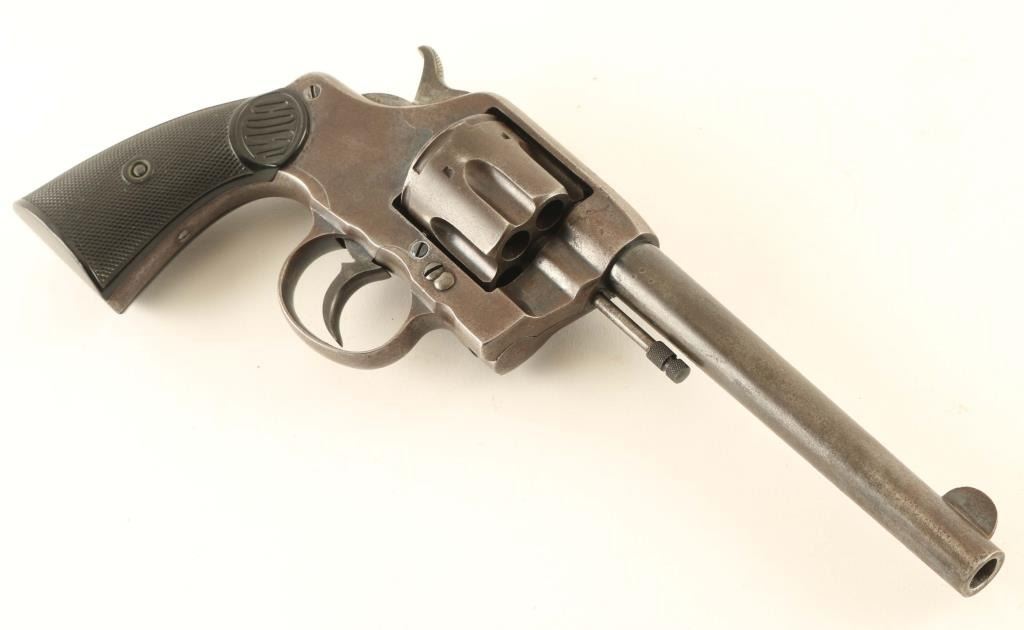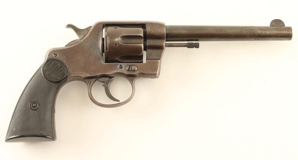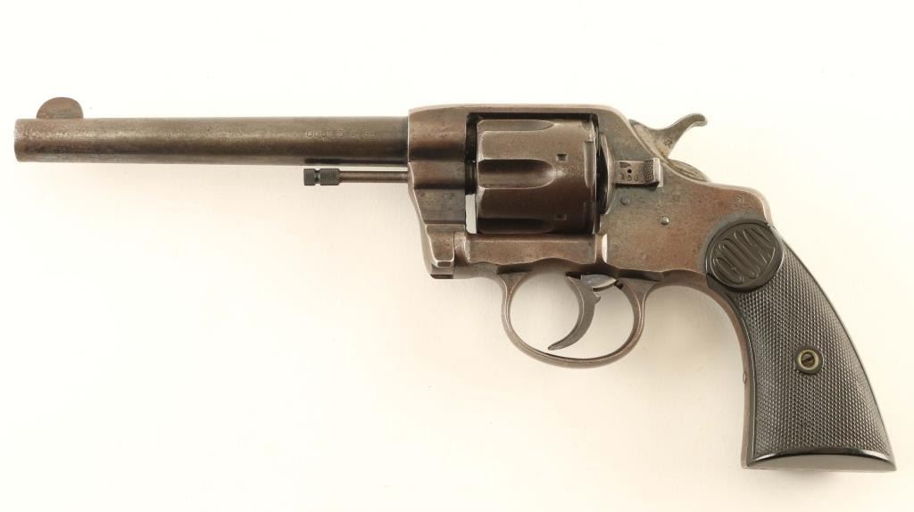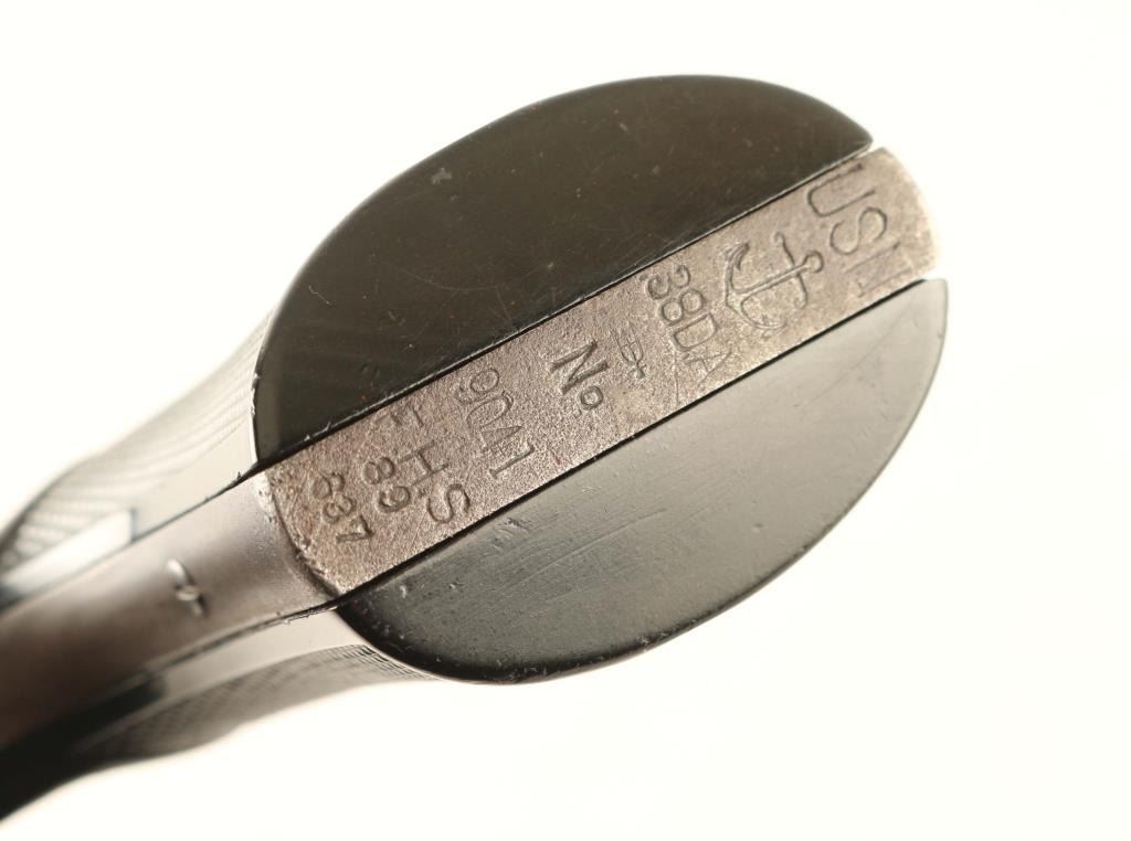 US Military revolver features 6" barrel, fixed sights, swing-out 6 shot cylinder, single/double action. Bore is fair to good condition, strong rifling, visible pitting. Cylinder charge holes are good condition. Metal finish is full coverage of brown patina turning to pinprick pitting, traces of blue in protected areas, bare metal showing on high spots. Grips are very good condition black Gutta Percha type, marked "Colt". Cylinder spins freely when trigger is forward. Action operates smoothly and has tight lockup with trigger to rear. Markings include trident stamp, rampant colt in circle, "USN / (anchor emblem) / 38DA" at bottom of frame. Cylinder latch and frame numbered "153". Condition is NRA Fair *** Antique Firearm ***