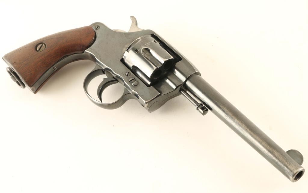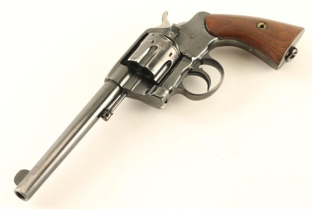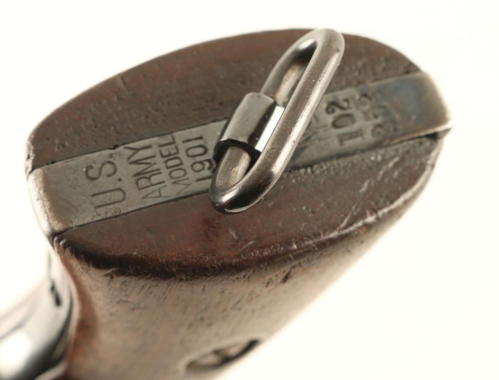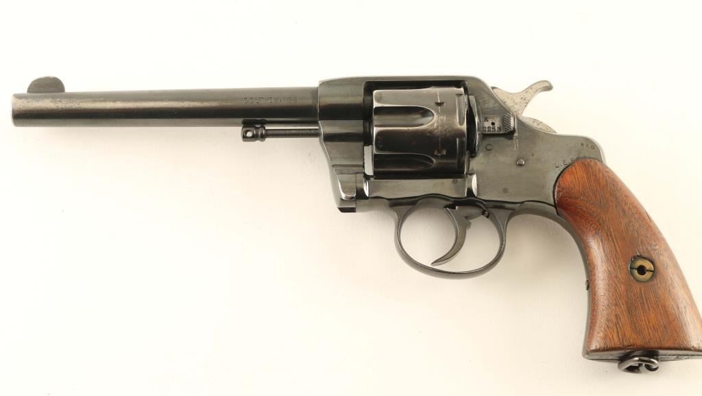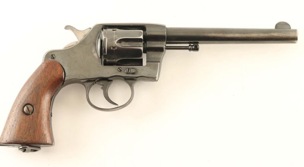 US Military revolver features 6" barrel, fixed sights, swing-out 6 shot cylinder, single/double action, lanyard ring on butt. Bore is good or better, bright with strong rifling, some tiny pits observed near muzzle. Cylinder charge holes are bright and smooth. Retains 85% dark black color re-blue, bare metal showing on high spots, holster wear at muzzle. Grips are good or better condition walnut, small dents and gouges, fit to frame is good. Hammer is blued with sides polished bright metal. Action operates smoothly, a little heavy, with slightly loose lockup. Markings include "RAC" and "LEB" inspection stamps, "US ARMY MODEL 1901" at bottom of frame. Observed numbers match. Condition is NRA Good *** Antique Firearm ***