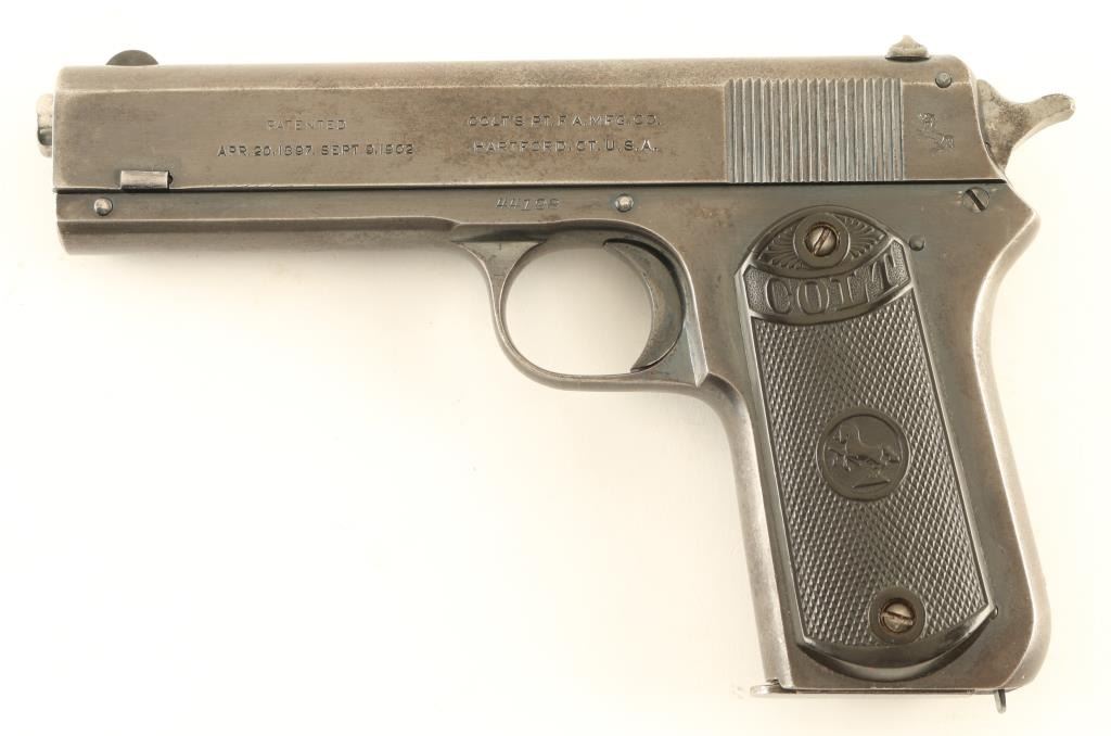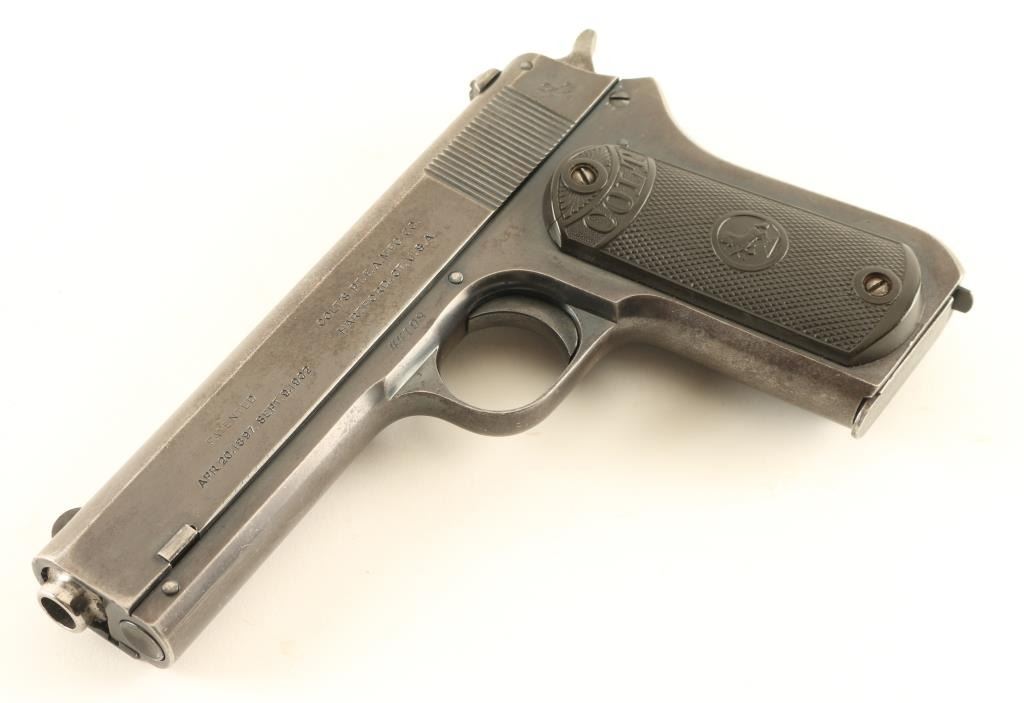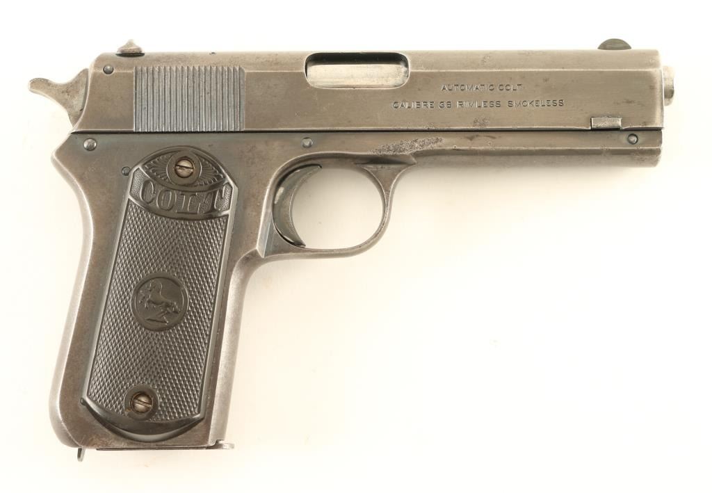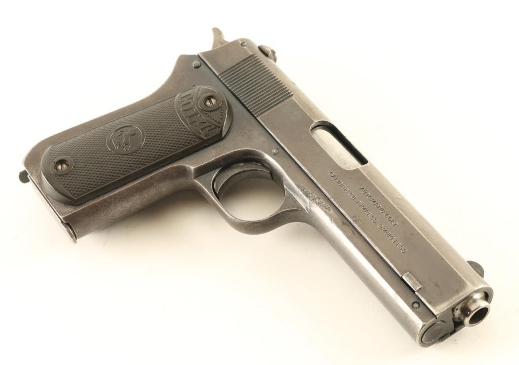 Semiautomatic pistol features blued finish, checkered black Gutta Percha grips, 4.5" barrel, fixed sights, heel magazine release. Fires 38 ACP, NOT the more powerful 38 Super. Bore is fair to good condition, with strong rifling, even light pitting. Retains 65% blued finish, turning brown from patina on left side & top of of slide, on front & backstrap. Area of pitting of right side of frame near trigger guard. Rampant Colt logo on left of slide is sharp. "COLT" banner grips are good condition with no visible cracks or chips. Includes one magazine. Condition is NRA Good++ *** C&R Firearm ***
