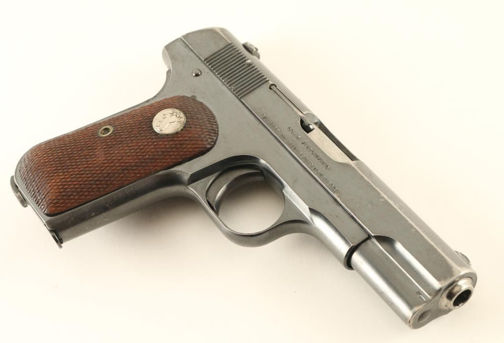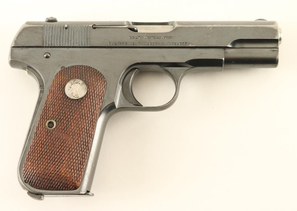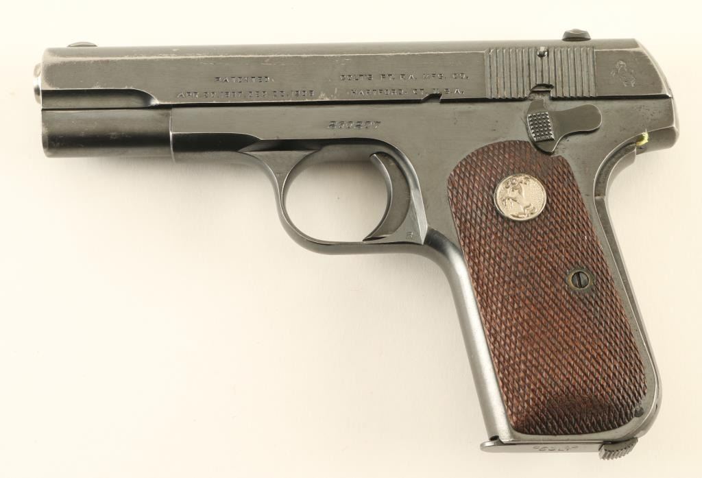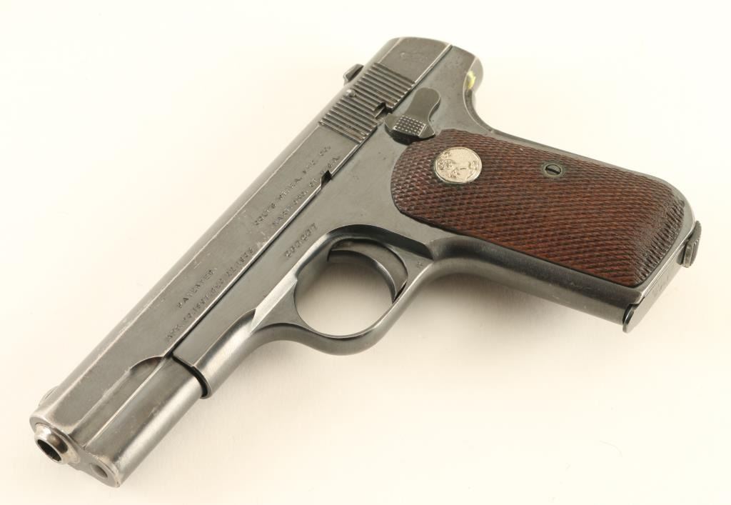 Semiautomatic pistol features blued finish, checkered wood grips with nickel Colt medallions, 3.75" barrel, fixed sights, manual safety, grip safety, magazine release at heel. Bore is in very good condition. Retains 85% bright blue with bare metal on edges of slide, rear and butt of frame, at many scratches along sides of slide. All markings are sharp including the Rampant Colt stamp. Includes one magazine marked "CAL 32 / COLT". Condition is NRA Very Good *** C&R Firearm ***
