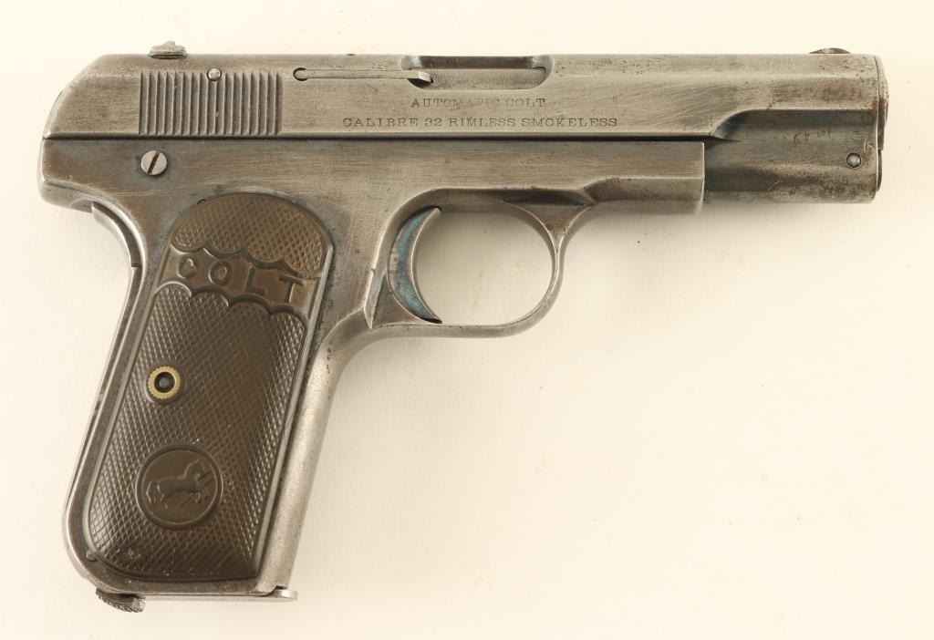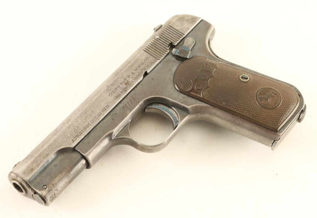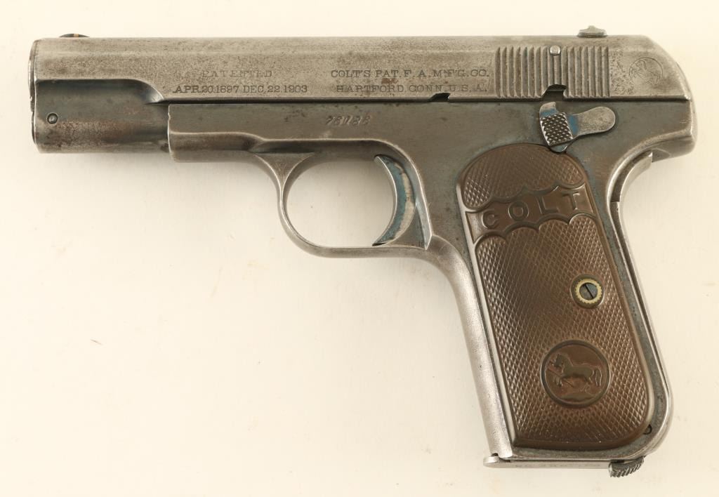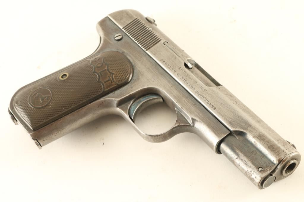 Semiautomatic pistol features blued finish, chocolate brown colored gutta percha grips, 3.75" barrel, fixed sights, manual safety, grip safety, heel magazine release. Bore is fair condition, dark grooves with tiny pits, shallow rifling. Metal surfaces retain 20% blue, some bright color remains in protected areas of frame, mostly thinning gray color or patina gray bare metal, many small pits on slide. Grips are good condition, no visible cracks, some small divots. Includes one magazine. Condition is NRA Good *** C&R Firearm ***