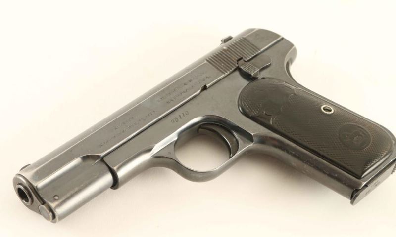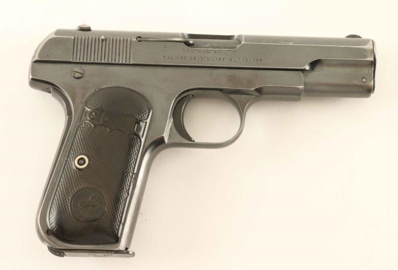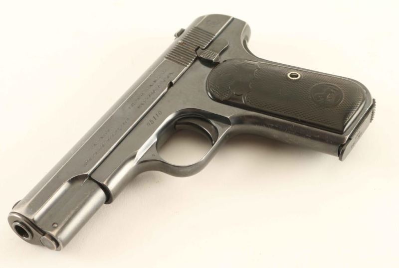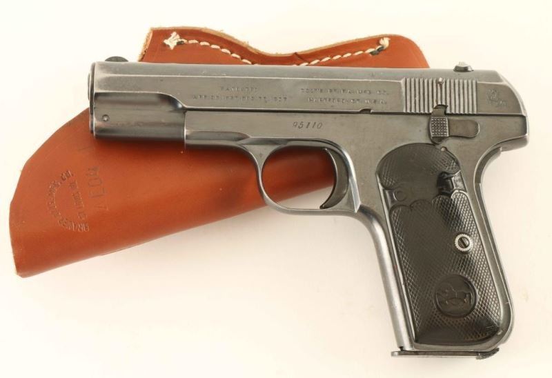 'Type II' Early concealed hammer semi-automatic pocket pistol chambered in .32 Auto, circa 1910. Features a blued finish, 3.75" barrel with removable bushing, fixed round blade front sight, drift adjustable 'u' notched rear sight, thumb safety/slide stop, grip safety, factory .380 magazine, and Colt two-piece checkered black hard rubber grips with a Rampant Colt inside a circle molded into them. Includes a smooth brown leather clip holster by Brauer Bros of St. Louis Missouri. Pistol retains approximately 85% of it's old professional refinish showing holster wear and scattered handling marks/scratches. Action is smooth, bore is very good+ and the hard rubber grips are good as worn semi-smooth. Condition is NRA very good as refinished. ***C&R Firearm***