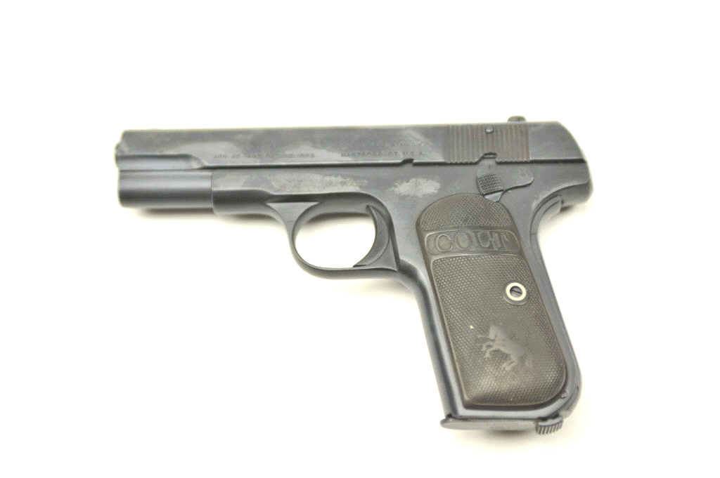 Colt 1903 Pocket Hammerless Semi-Auto pistol in .32 ACP caliber, S/N 317033. This pistol shows 98% old professional re-blued finish remains with good slide markings other than rampant Colt is light. The grips are goodwith some wear. Correct marked mag. Good action and good bore. (C&R/PPT) Est.: $300-$600