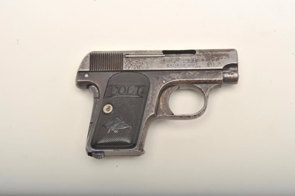 Colt 1908 .25 ACP semi-auto pistol, S/N 21623 made in 1910. This pistol remains in original good condition with 20%-30% original blue and balance drifted to gray-brown with minor erosion and light pitting. Early gripswith word “Colt” showing matching wear but good. The markings are good and show early patent dates. The action is good and the bore is fair to good. Formerly award winning Ron Kowal collection. (C&R) Est.: $350-$700