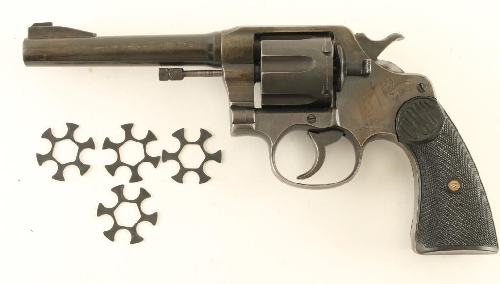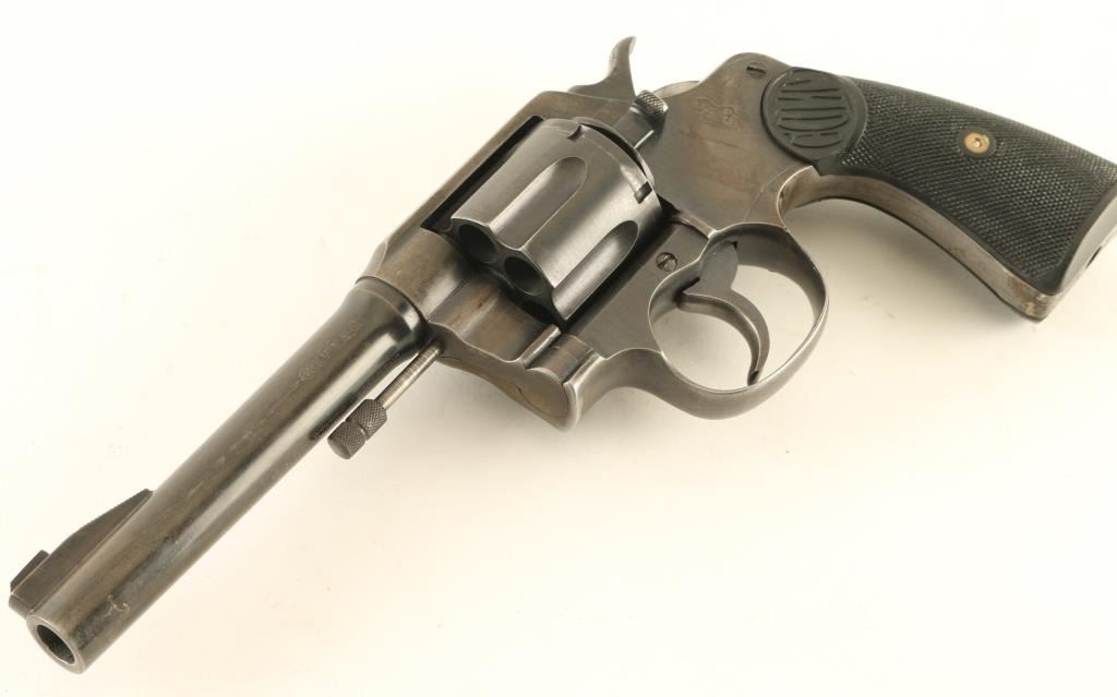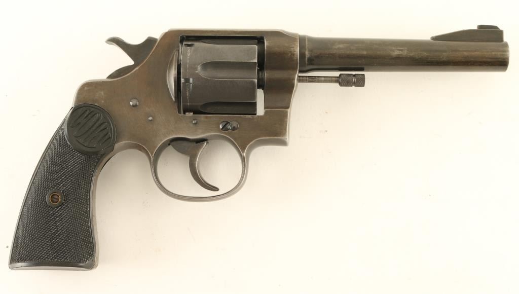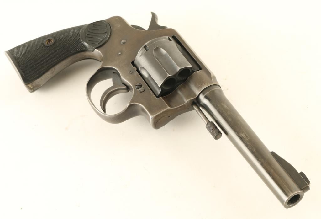 US military double/single action revolver features blued finish, checkered black gutta percha grips embossed "COLT", 5.5" barrel, fixed sights, hole in frame butt for lanyard loop (lanyard loop missing). Front sight has been replaced with a screw-on type base & ramp sight. Bore and charge holes are very good condition, dirty from firing. Retains full coverage of mottled brownish gray bluing, appears similar to use of touch-up cold blue, with some darker more even color in protected areas. Cylinder is very good dark colored blue, with cylinder drag line. Screw slots on left side show marring. Grips are good to very good, no visible cracks. Action is smooth with tight lock-up. Condition is NRA Good ++ *** C&R Firearm ***