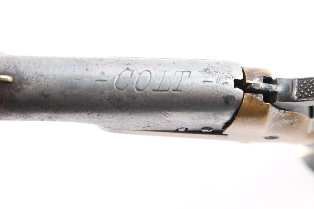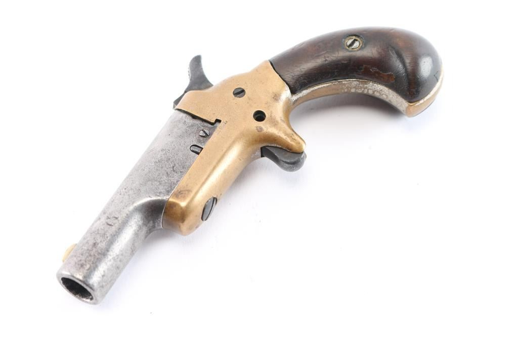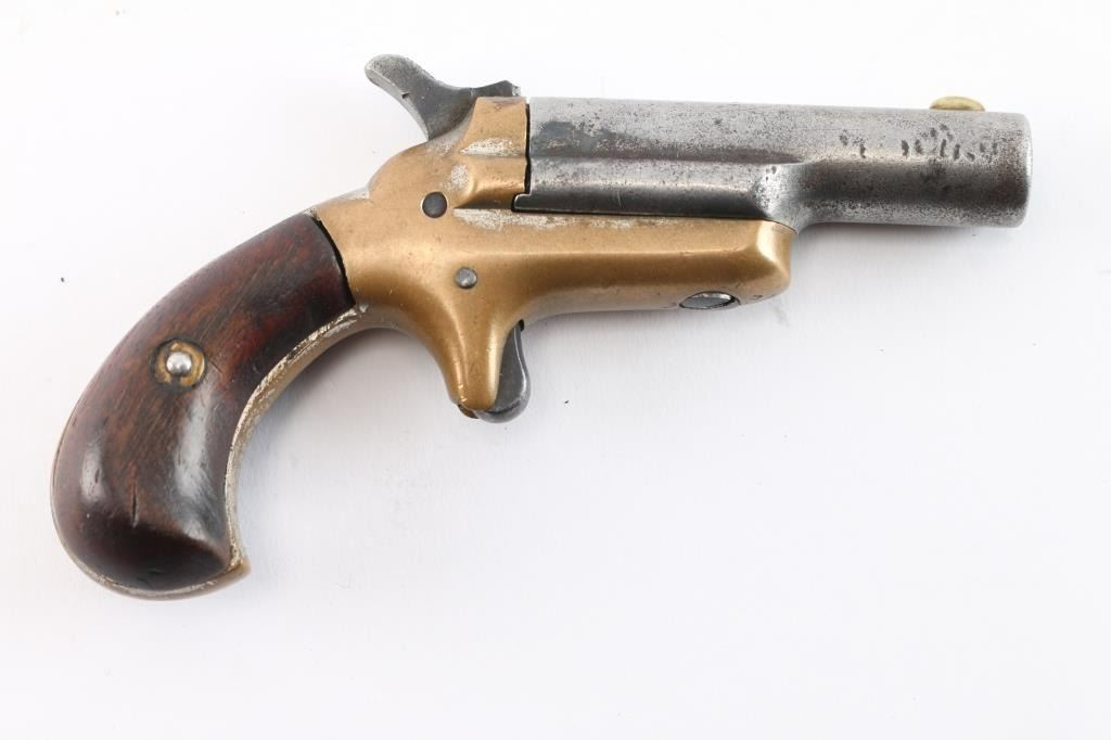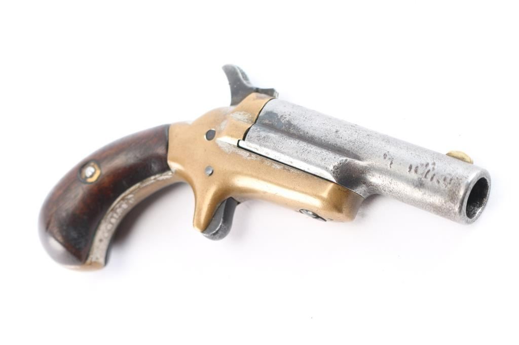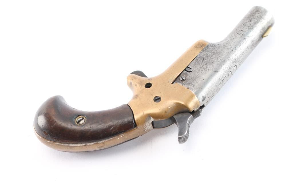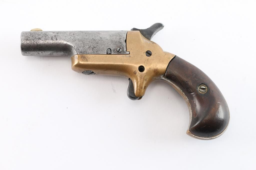 The Colt Third Model Thuer Derringer in .41 Caliber was Manufactured from 1875 to 1912. The serials of these firearms range from 1-45,000. This Thuer Derringer's serial number is #15396. We estimate this firearm to be manufactured pre 1898. Early single shot, spur-trigger derringer, with 2-1/2" round barrel, brass blade sight. Barrel pivots to the right for loading. Smooth walnut birds head grips, fixed sights, and bronze frame. Action is tight and in good working order. Barrel marked "-Colt-", left frame marked ".41 CAL" and serial number on frame under left grip. Traces of nickel finish on frame. Bore has rifling present, scattered pitting, grips are very good.