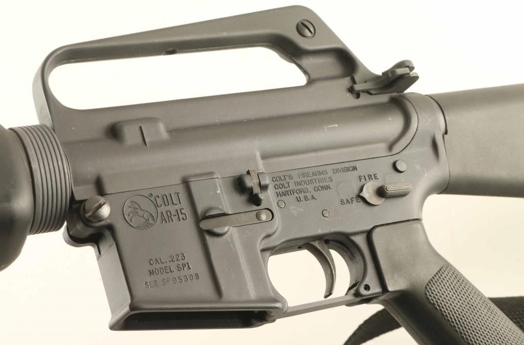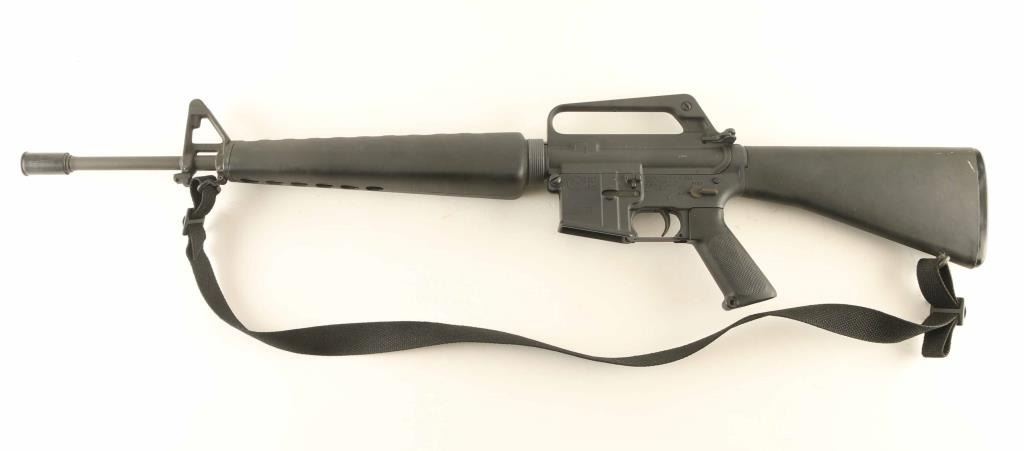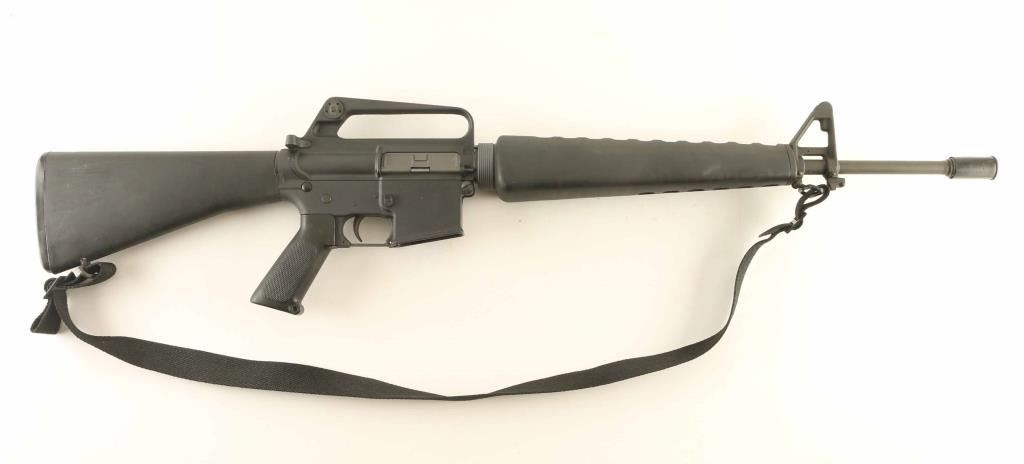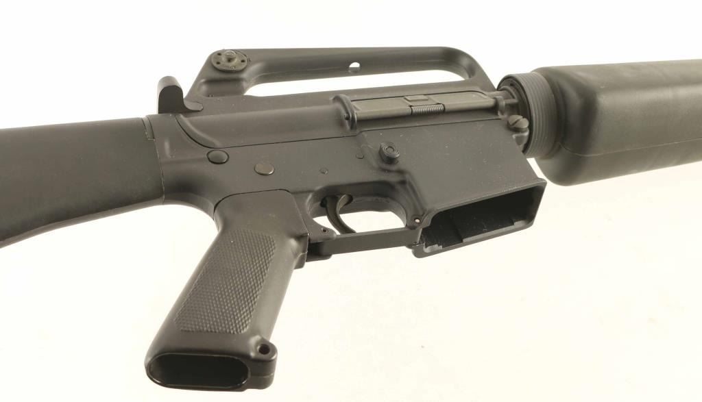 Semiautomatic rifle features parkerized finish, black plastic furniture, A1 length fixed stock, triangular cross section hand guards, 20" lightweight barrel, flash suppressor, bayonet lug, adjustable sights (front post sight with protector ears, rear L-flip peep), early style A1 upper receiver without forward assist, early lower receiver without fence around magazine release, dual screw style front take down pin, manual safety. Barrel appears earlier 1-12 twist, marked "MP CHROME LINED". Bore is excellent. Overall external appearance is very good or better, with signs of use and handling, few spots where finish has rub marks on sharp edges. Top of bolt release lever is broken off. Includes black nylon sling and USGI type black plastic muzzle cover. No magazine. Condition is NRA Very Good *** Modern Firearm ***